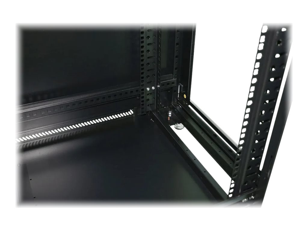 | Egenskaber | Låsbar frontdør, top- og bundkabelindgangspunkter, omvendelig frontdør, fødder med justerbar højde, kabelrouting-åbninger, 4 topblæserudskæringer, hærdet glasfrontdør, ventilationshuller, aftagelige sidepaneler, jordet ledning, nummererede skinnemarkeringer, robuste styrehjul |