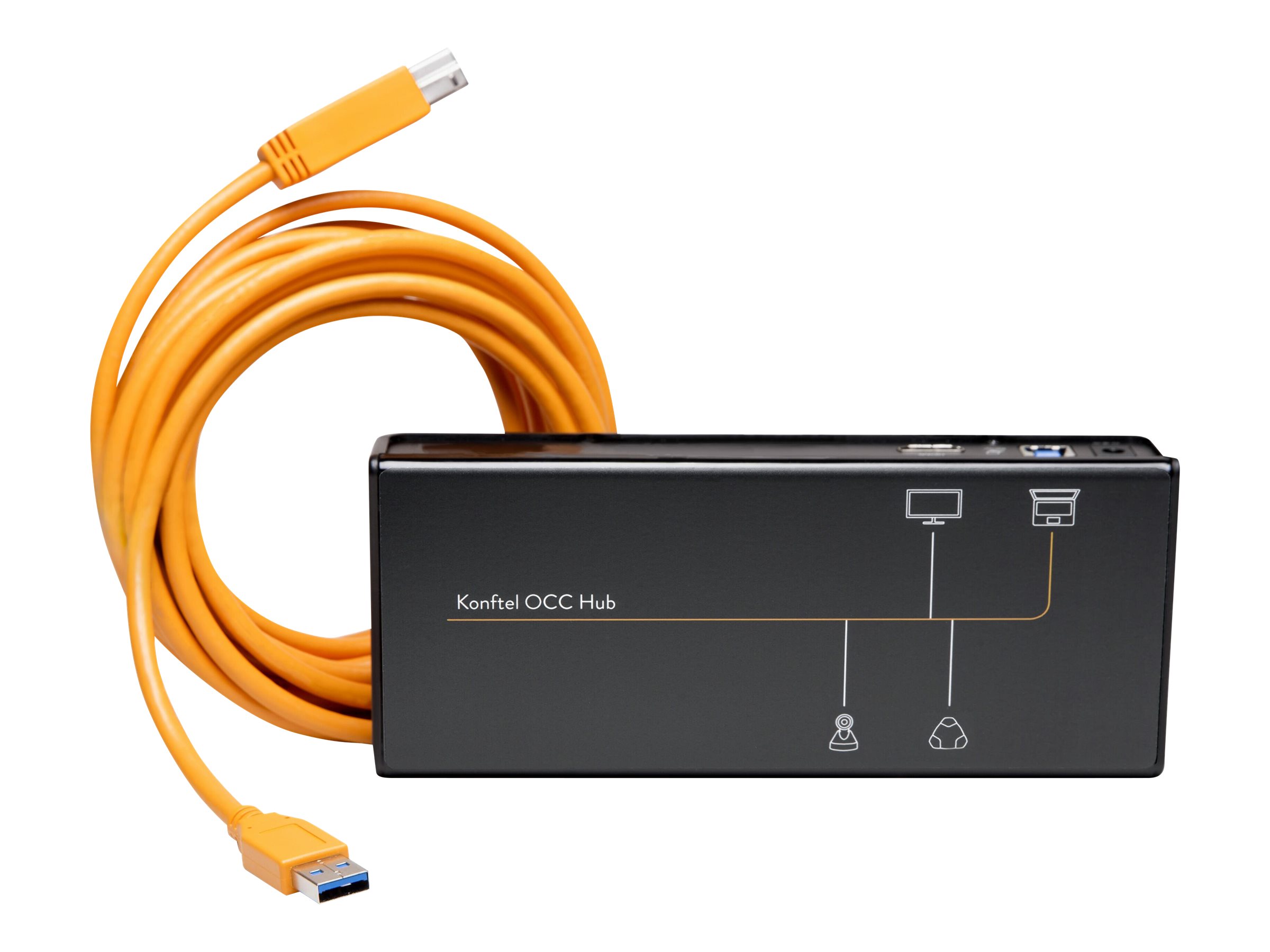 Konftel OCC Hub er kernen i Konftels videokonferenceløsninger til alle typer mødelokaler. Den understøtter Konftel One Cable Connection, som gør, at du med et enkelt USB-kabel kan tilslutte kameraet, højttalertelefonen og lokalets skærm til samarbejdsappen på din bærbare computer.