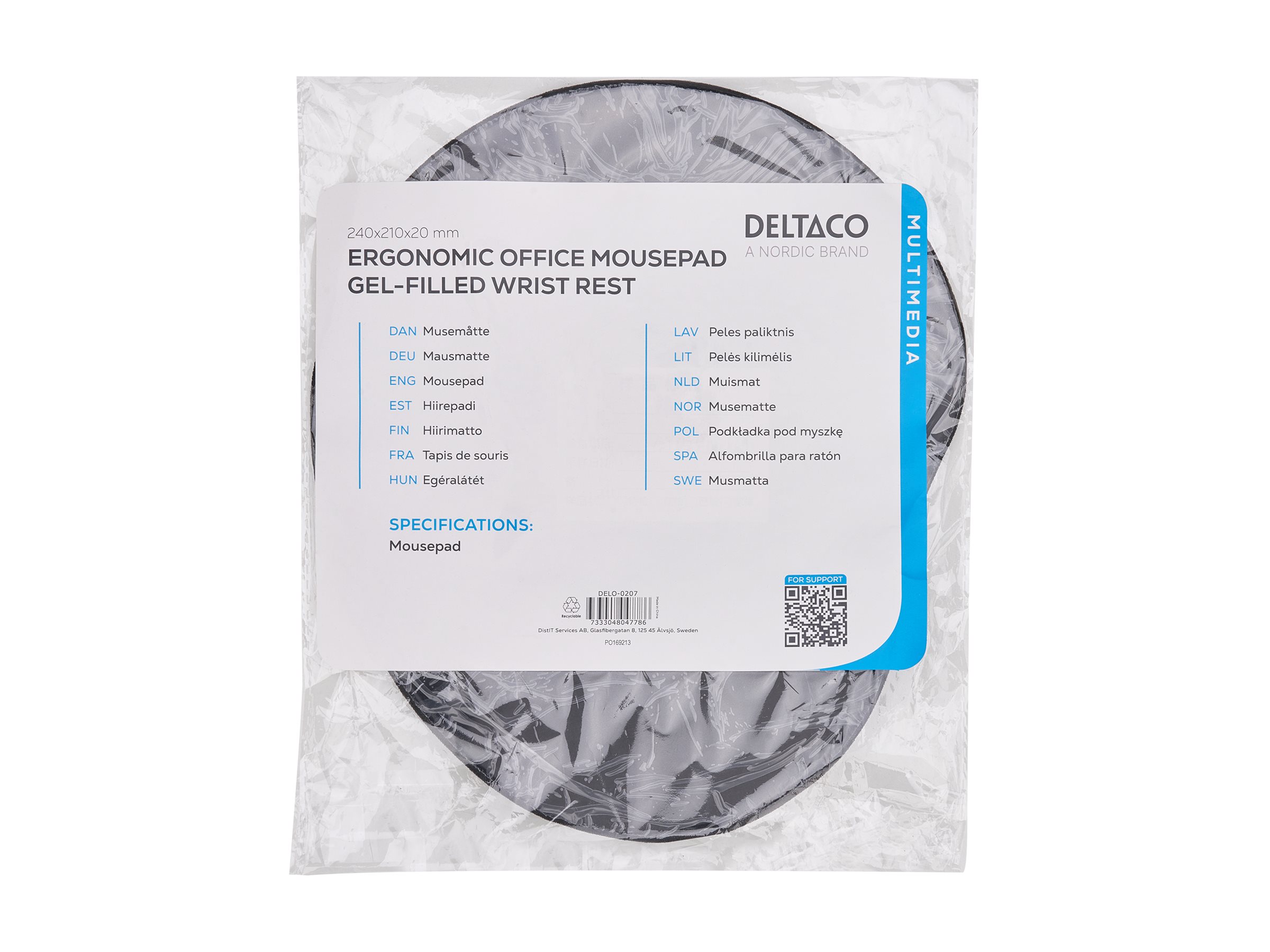 DELO-0207 er en mellemstor musemåtte, der er lavet af blød gel og stof, perfekt til at give ergonomisk håndledsstøtte og undgå gentagende overbelastning af håndled ved flere timers computerbrug.