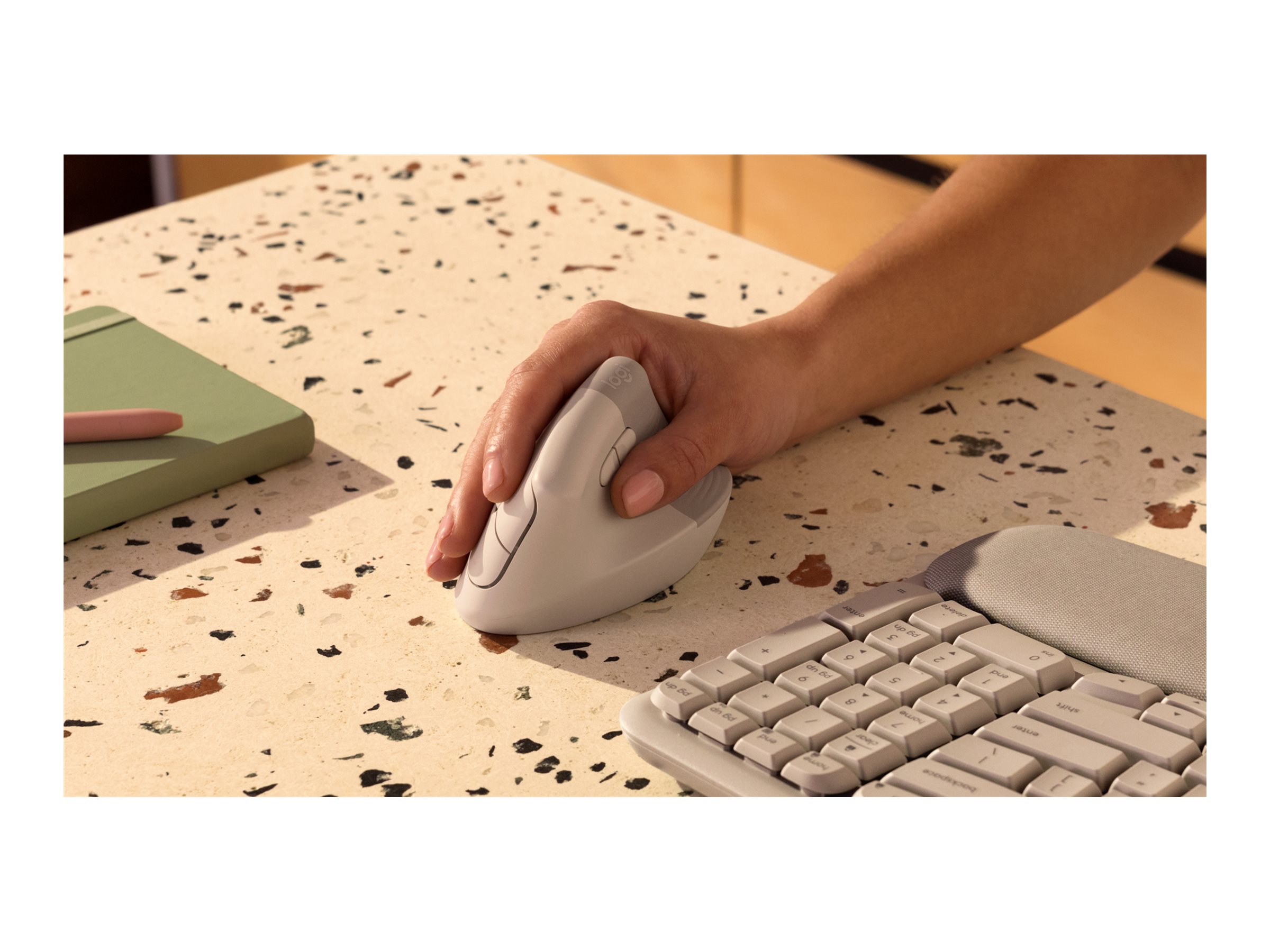 Bliv komfortabel fra solopgang til sen aften med Lift Vertical-ergonomisk mus. En fantastisk pasform til små til mellemstore hænder, Lift kommer i tre tidløse farver – også med en venstre mulighed