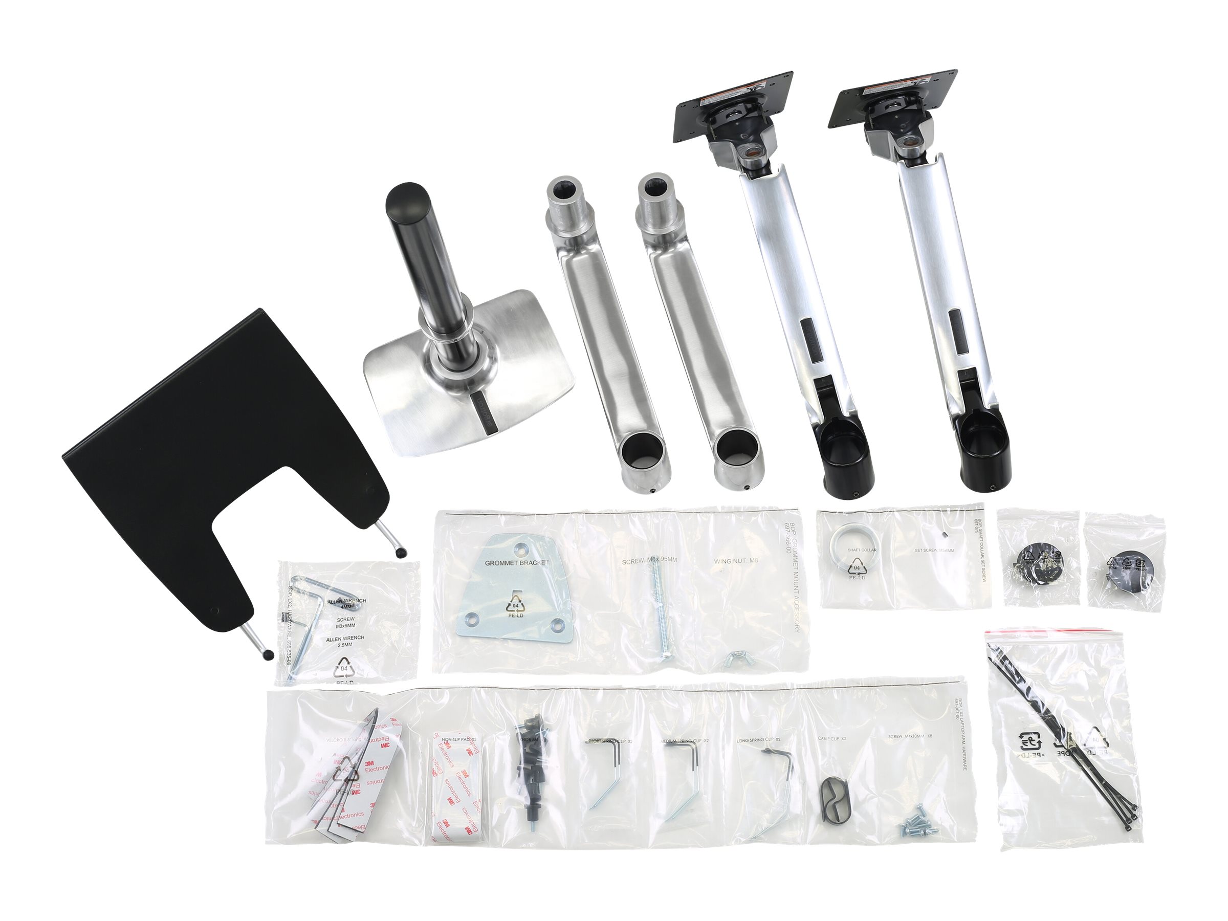 | Monteringskomponenter | Klemme til montering på skrivebord, pakning til gennemføring, stang, 2 artikulerende arme, 2 forlængelses beslag, notesbog-bakke |