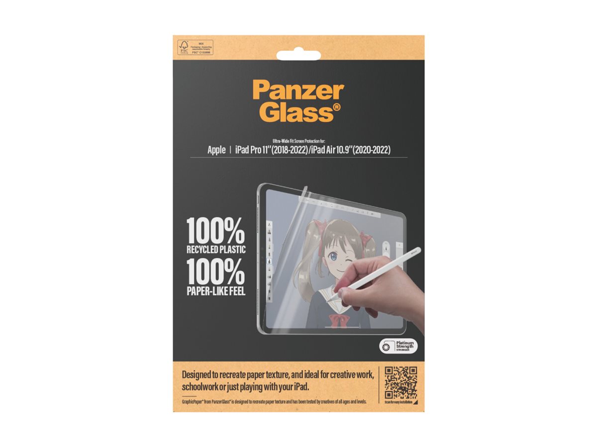 Præsenterer vores opdaterede og prisvindende skærmbeskytter, GraphicPaper. Skærmbeskytteren er lavet af 100% genanvendt plastik. Den holder ikke blot slag, stød, ridser og revner på sikker afstand af din skærm, men giver dig også fornemmelsen af at tegne, skrive og arbejde på rigtigt papir. GraphicPaper er udviklet i samarbejde med kreative børn og voksne på alle niveauer. Den er et ideelt værktøj, hvis du elsker at være kreativ, men egner sig også perfekt til at tage noter, brainstorme på jobbet, lave skolearbejde osv. Den har størrelsen "Ultra-Wide Fit", som giver maksimal beskyttelse og en fuldendt skærmoplevelse, samtidig med at den efterlader plads til en case. Perfekt til dig, der vil beskytte hele fronten af din tablet. Og emballagen, ja, den er naturligvis FSC -mærket og kan genanvendes.
