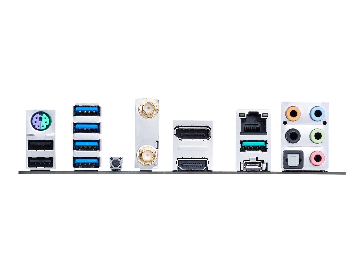 | Interface | 1 x DisplayPort | 1 x TOSLINK | 1 x LAN (2.5Gigabit Ethernet) | 4 x USB 3.2 Gen 1 | 1 x USB 3.2 Gen 2 | 1 x audio linje-ind - mini-jack | 1 x audio linje-ud - mini-jack | 1 x mikrofon - mini-jack | 1 x PS/2-tastatur/mus | 1 x HDMI | 1 x USB-C Gen2 | 2 x USB 2.0 | 1 x audio linje-ud (bagtil) - mini-jack | 1 x audio linje-ud (centrum/subwoofer) - mini-jack |