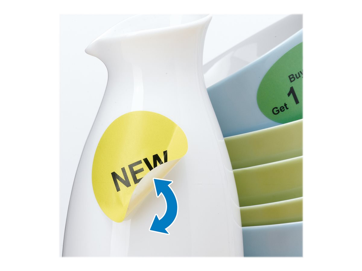 Runde etiketter på A4-ark med Movables-Technology: kan trækkes af og sættes på igen
