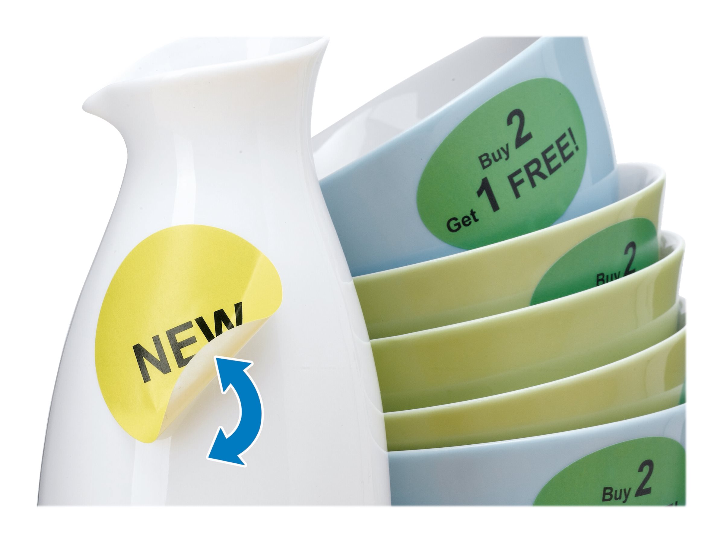 Runde etiketter på A4-ark med Movables-Technology: kan trækkes af og sættes på igen
