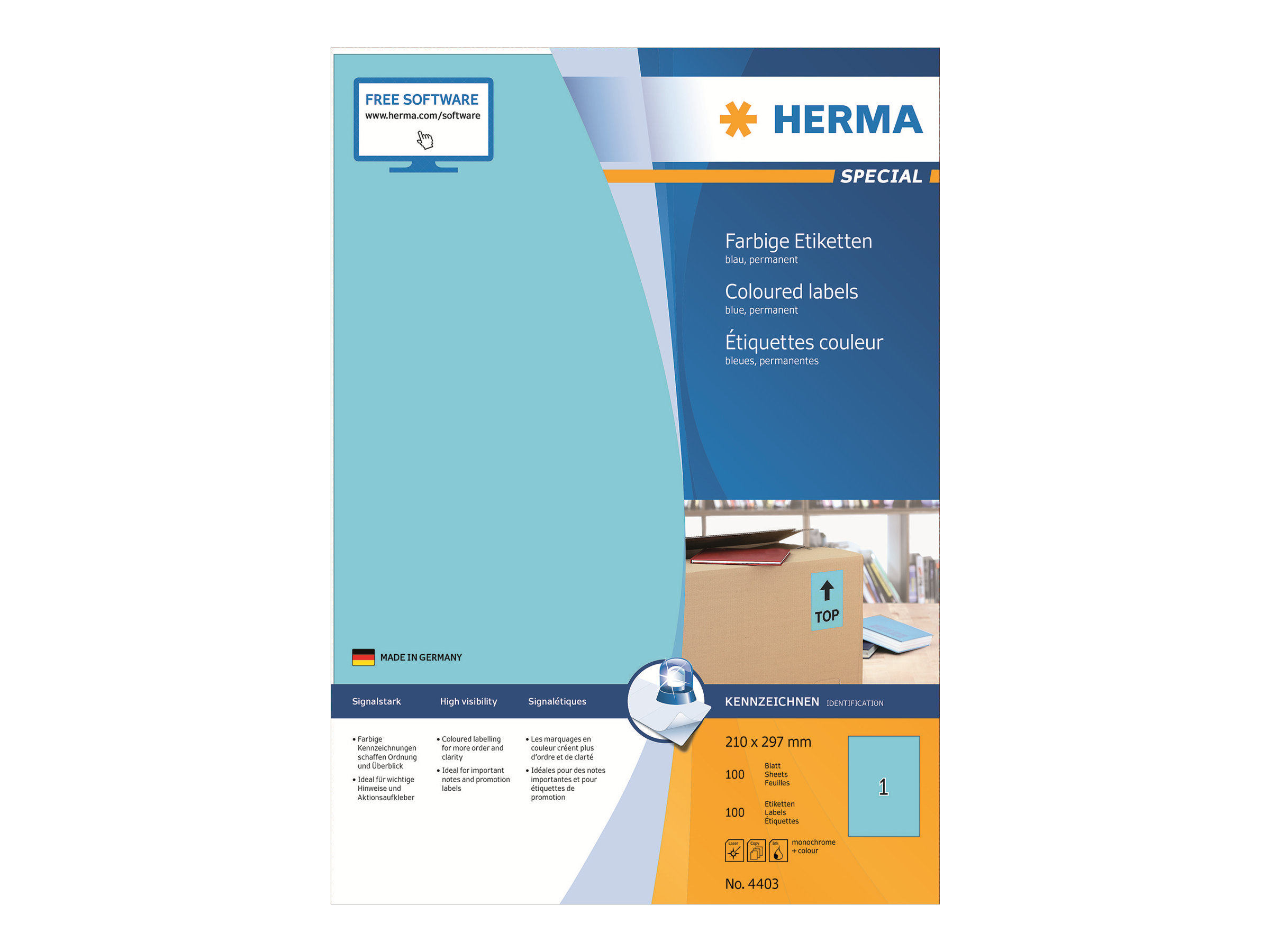 Farveetiketter på A4-ark, selvklæbende. Ideelle som signalmarkeringer, f.eks. til advarsler, hasteforsendelser, adresseændringer, farvekodning, kampagner, .... Miljøvenlig: bleget uden anvendelse af klor, FSC Mix Credit, lim uden opløsningsmidler. Etiketterne kan genbruges 100 % med affaldspapir, emballage og æske. Særdeles gode udskrivningsresultater på alle laser- og inkjet-printere, kopimaskiner, farvelaserprintere og farvekopimaskiner. Problemfri redigering i kraft af sikkerhedskant hele vejen rundt og optimal fladhed. Gratis software-løsninger: www.herma.com/software.
