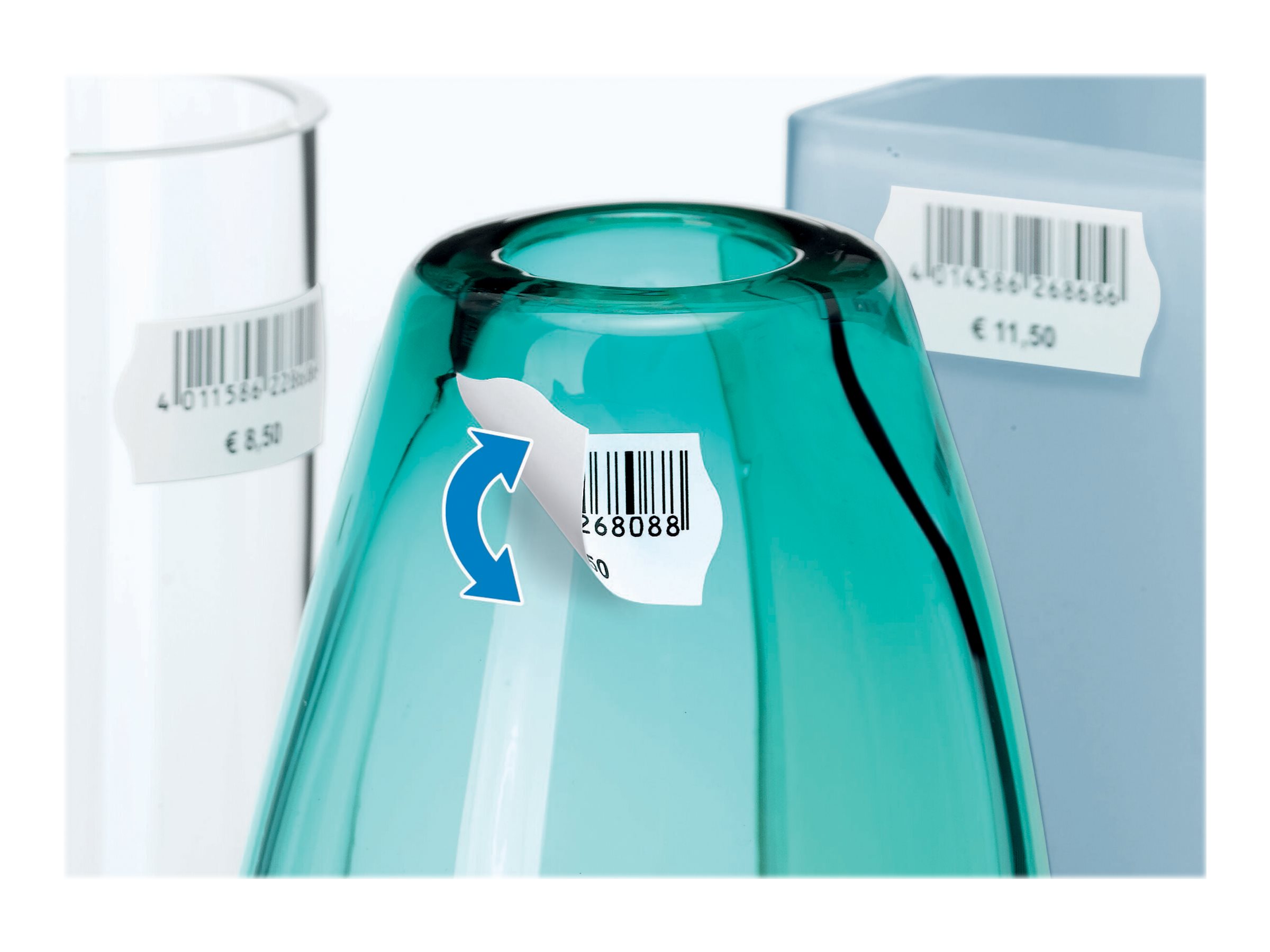 Fjernelige prisetiketter i specialform på A4-ark. Med Movables-Technology: kan trækkes af og klæbes på igen
