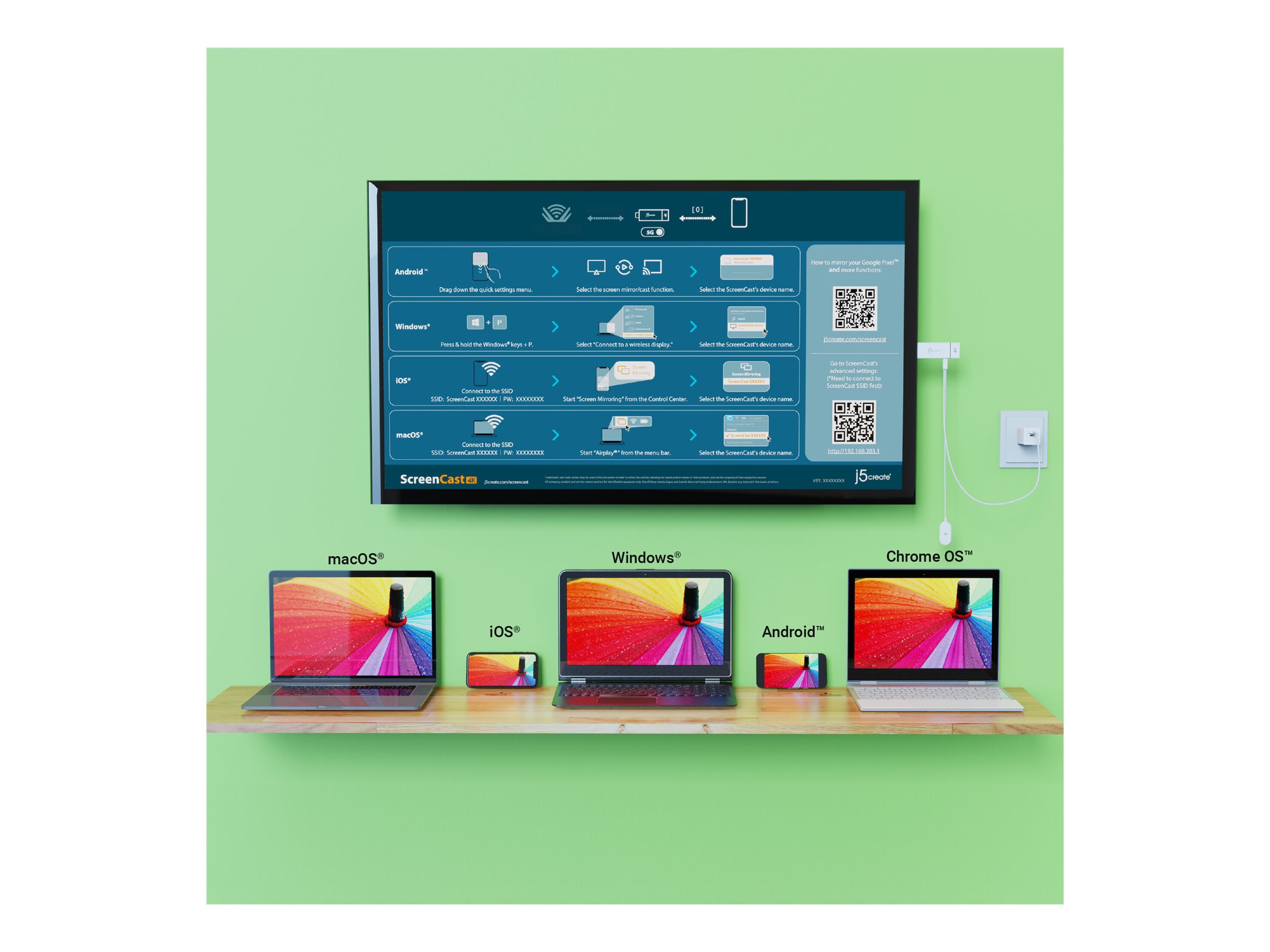 Vis indhold fra en telefon, tablet eller bærbar computer trådløst på en større skærm med denne 4K trådløse skærmadapter fra ScreenCast. Denne trådløse skærmadapter kan bruges med flere forskelige trådløse skærmstandarder (Miracast , AirPlay og Chromecast ) og med dine enheder og Tv-sæt. Det kan bruges i styresystemerne Windows , macOS , iOS og Android og andre computere, tabletter og mobiltelefoner, der har en cast-funktion.