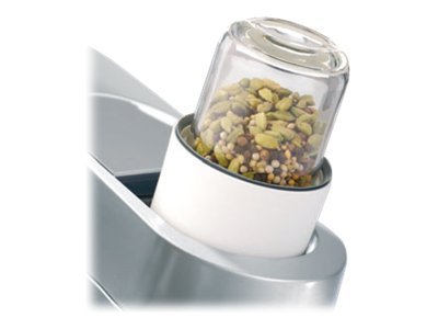 Fantastisk tilbehør der kan hakke, blende og blande små portioner af mad i dets glasskål. Den er perfekt til babymad, krydderier, kaffe, marinader, dressinger, pureer, urter og nødder. Den kommer med tre glaskrukker, som du kan bruge til opbevaring. Det lille glas gør det lettere ar hakke hurtigere og mere fint, hvorimod den større hakker er bedre til kaffebønner eller lignende.