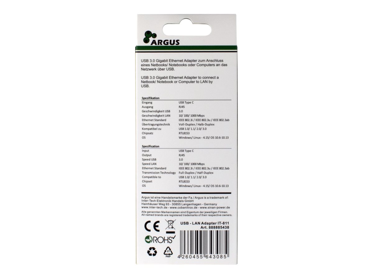 | Produktbeskrivelse | Argus IT-811 - netværksadapter - USB-C - Gigabit Ethernet |
