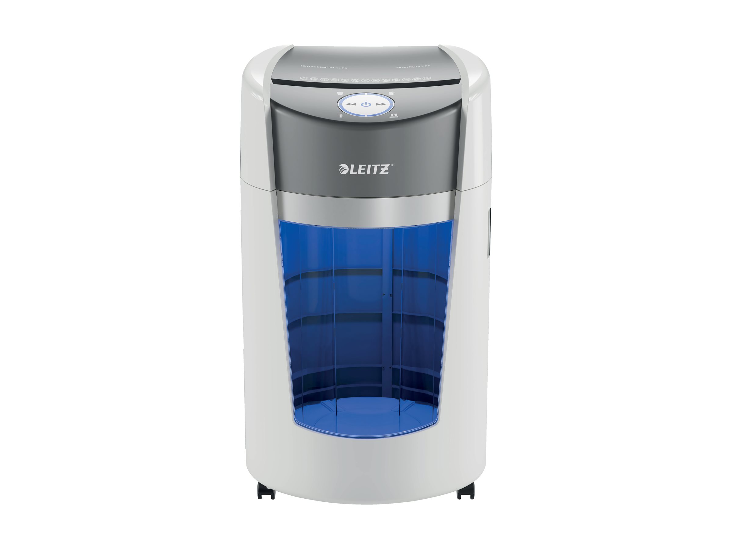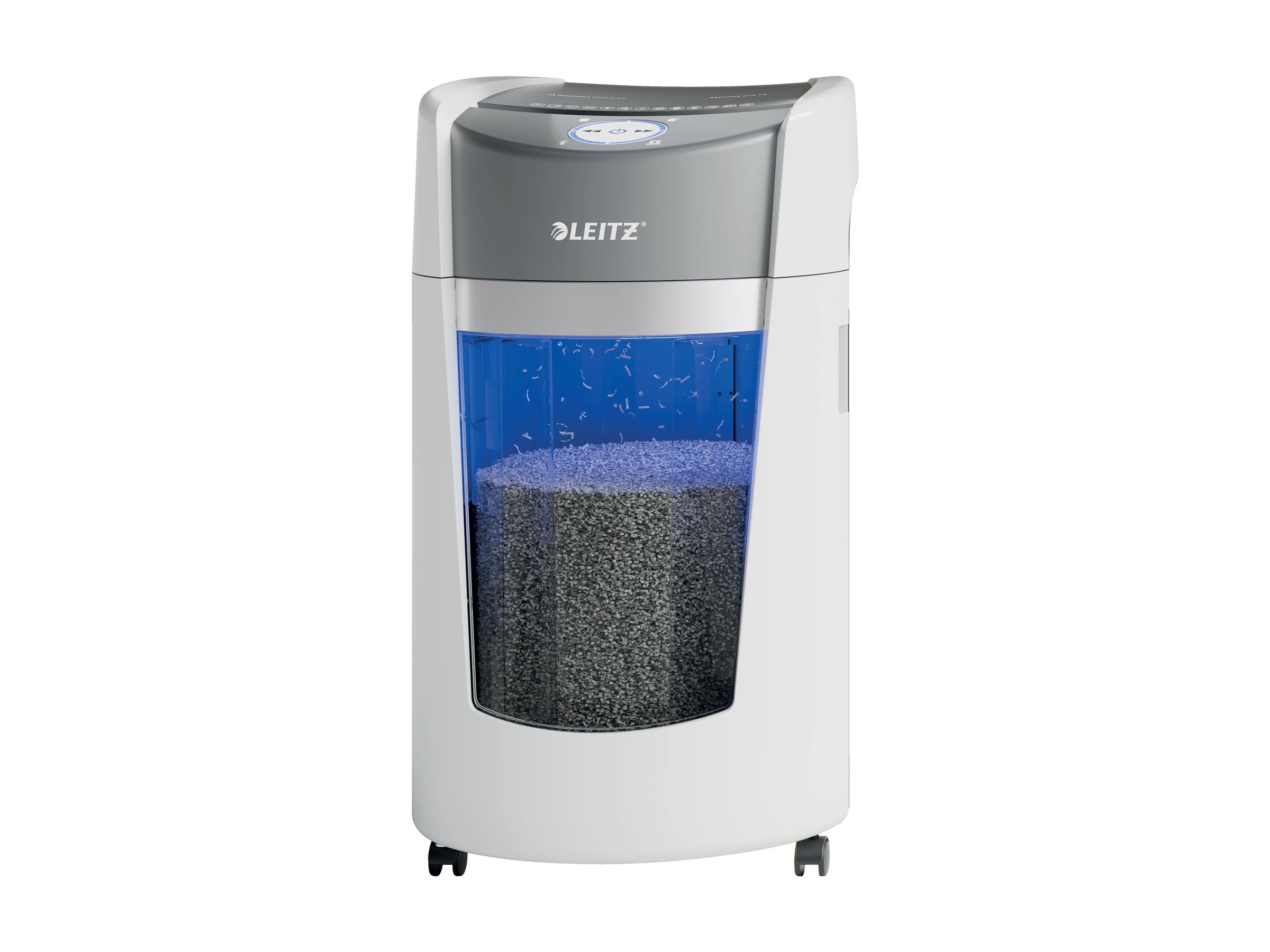 Leitz IQ OptiMax Office makulatoren giver en innovativ og stilfuld makuleringsløsning, samtidig med at den sikrer enestående dokumentsikkerhed og ro i sindet. Denne DIN P5-papirmakulator med høj sikkerhed makulerer ubesværet op til 10 A4-ark ad gangen til mikromakulerings stykker. IQ OptiMax har en unik Beholder Rotation Teknologi (BRT), der effektivt maksimerer kapaciteten med +33%. Den roterende beholder sikrer en flad og jævn fordeling af papiret, så papirstrimlerne ikke danner en top i beholderen, hvilket gør det muligt at makulere yderligere 140x A4-ark, før den skal tømmes. BRT betyder, at det ikke er nødvendigt at fjerne eller ryste beholderen; indikatoren for "fuld beholder" aktiveres først, når den når 100 % kapacitet. Den store beholder på 35 liter kan rumme op til 550 A4-ark og lyser blåt under brug for at give den ultimative makuleringsoplevelse. Det intuitive roterende LED-display indeholder røde advarsler om forskellige tilstande som f.eks. fuld beholder og åben dør. Leitz IQ OptiMax er alsidig til ethvert arbejdsmiljø på grund af sin ultra-stille drift, slanke design og imponerende holdbarhed. Kontinuerlig driftstid på 120 minutter. Hvid farve. *Leitz IQ OptiMax testet med og uden beholder rotation-teknologi.
