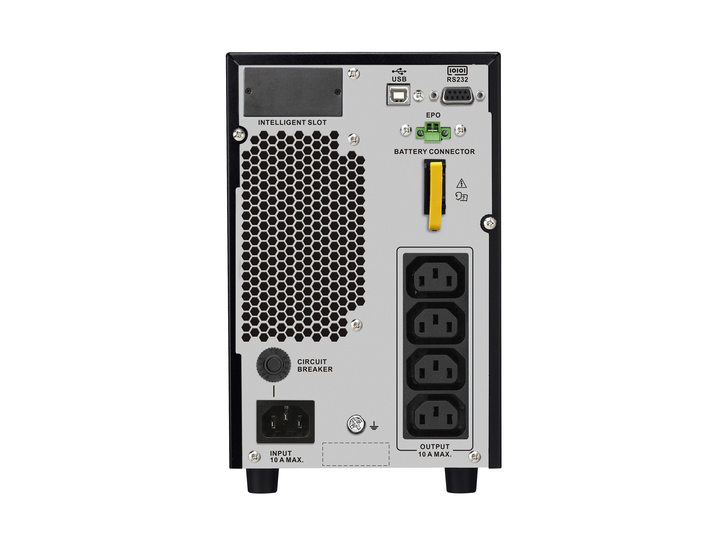 | Egenskaber | Lodret retning, hørlig alarm, nødstrøm slukket, LCD-skærm, intern bypass, Eco-Mode, generatorkompatibel, Intelligent Battery Management, dobbelt konvertering, lav batteri-alarm, overbelastningsalarm |