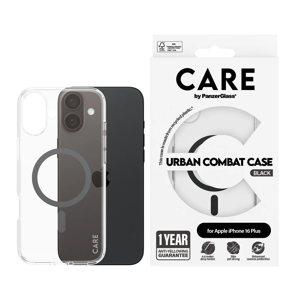 PanzerGlass CARE Urban Combat Case Flagship - Bagsidecover til mobiltelefon - MagSafe-kompatibilitet - Gennemsigtig / sort - for Apple iPhone 16 Plus