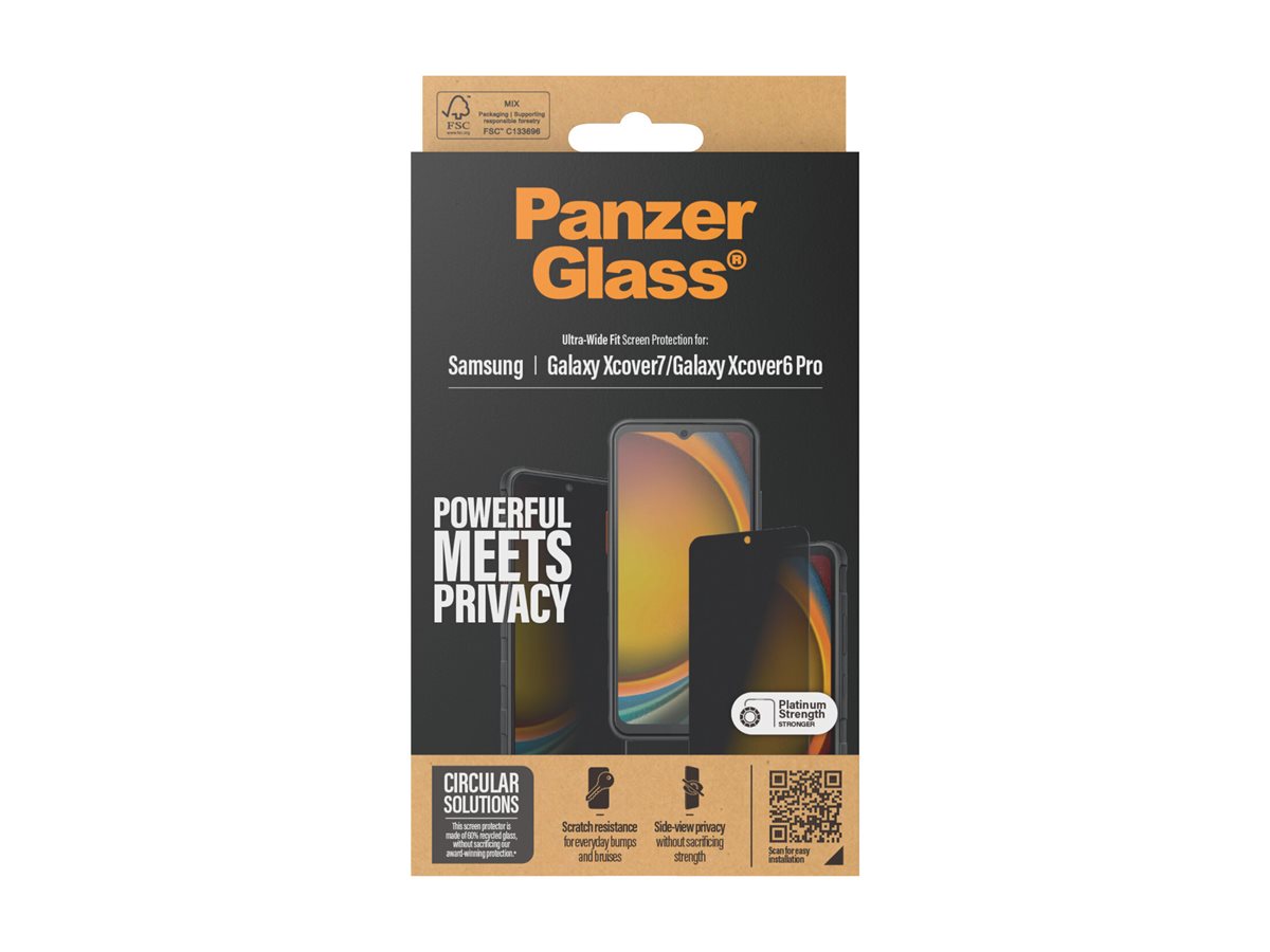 Private beskeder. Netbank. Pinkoder. Med den her skærmbeskytter fra PanzerGlass lavet af 60 % genanvendt glas er det slut med at bekymre dig om nysgerrige blikke fra folk, der sidder ved siden af dig på toget, i bussen eller på caféen. Det særlige privatlivsfilter skjuler nemlig indholdet af din skærm for alle andre end den, der sidder direkte foran skærmen: dig! Skærmbeskytteren har endda en smudsafvisende belægning og virker perfekt med skærmens ultrasoniske fingeraftryksscanner, så du kan låse telefonen op med et enkelt tryk, akkurat som du er vant til. Og skærmbeskyttelsen? Ja, den har aldrig været bedre! Skærmbeskytteren er 3 x mere ridsefast end vores modeller til S23-serien og holder både ridser, revner, slag og stød på sikker afstand. Eller sagt på en anden måde: Den forlænger levetiden på din telefon, så du en dag kan give den videre til en anden, som vil elske den lige så højt som dig. Det er ren telefonkærlighed. For jo længere vi kan holde vores enheder i live, jo længere kan vi vente med at producere nye enheder, som belaster miljøet. Og nu vi taler om miljøet, bruger den her skærmbeskyttelse 33 %* mindre papiremballage end tidligere modeller og leveres i en FSC -mærket æske, der kan genanvendes. Sammen med skærmbeskytteren får du en såkaldt EasyAligner, der gør installationen så legende let, at de fleste kan gøre det i første forsøg. Og ellers følger du bare trin-for-trin-guiden eller scanner QR-koden til sådan-installerer-du-videoen. Når først skærmbeskytteren sidder på telefonen, er det slut med at frygte synet af din skærm med kurs mod asfalten. Det kommer muligvis aldrig til at ske, men hvis det gør, vil du fortryde, at du ikke klikkede "Tilføj til kurv". Skærmbeskytteren har størrelsen "Ultra-Wide Fit". Det betyder, at den dækker fronten af din telefon, samtidig med at den giver dig en fuldendt skærmoplevelse og efterlader lidt plads langs kanterne til et cover. Vil du passe ekstra godt på din telefon, kan du kombinere skærmbeskyttelsen med et PanzerGlass cover og en PanzerGlass PicturePerfect eller Hoops kameralinsebeskytter. *Beregnet af tredjepartslaboratorium ved at sammenligne vægten af den nye papiremballage introduceret i 2023 med vægten af den tidligere papiremballage introduceret i 2022 (CPRTC, rapportnummer ZSA20231301-0016).