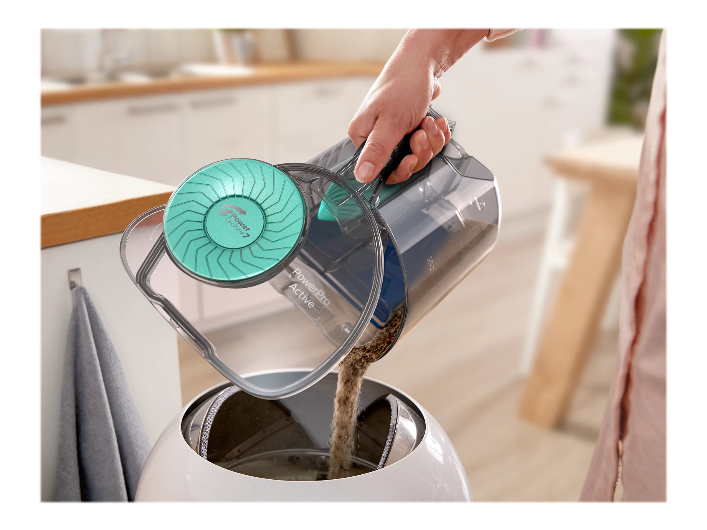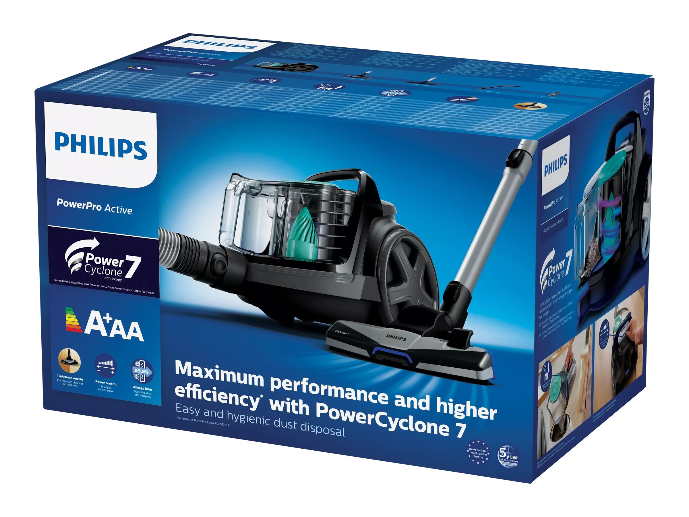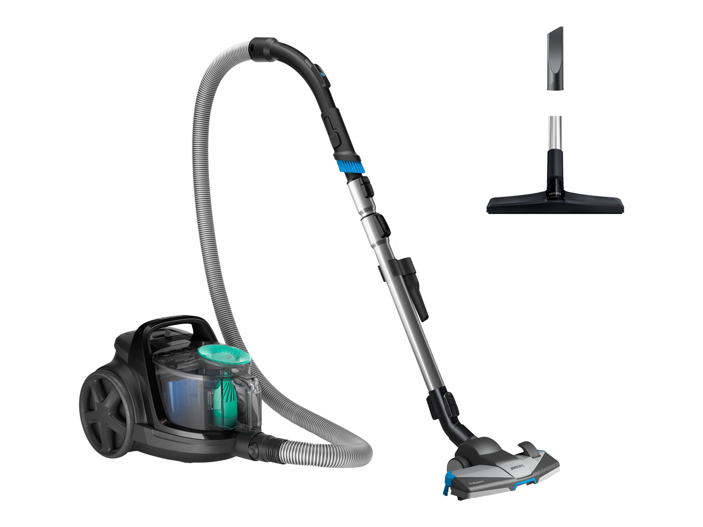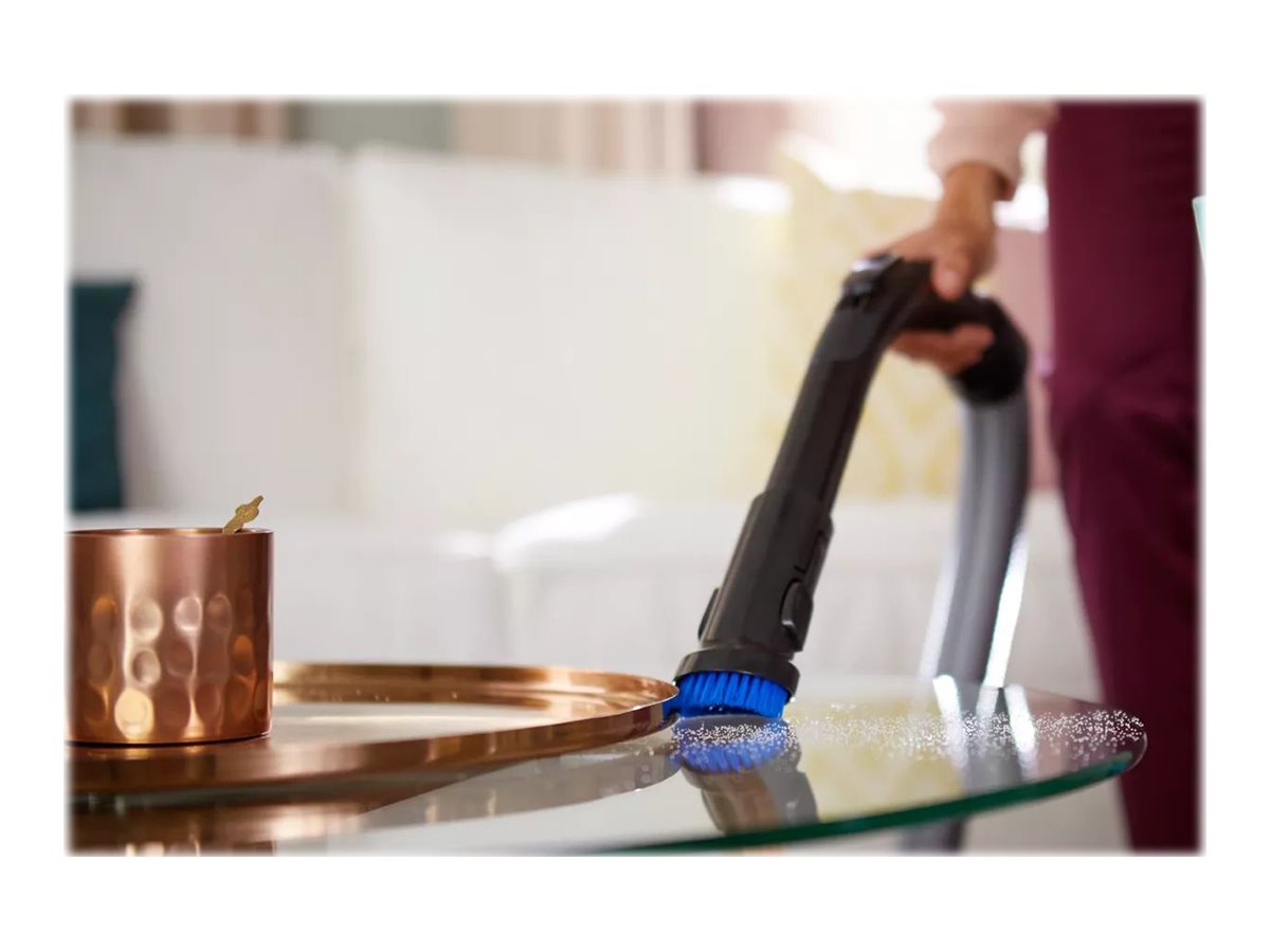 | Inkluderet tilbehør | Redskab til fuger, mundstykke til hårdt gulv, TriActive+ dyse, integreret børste |