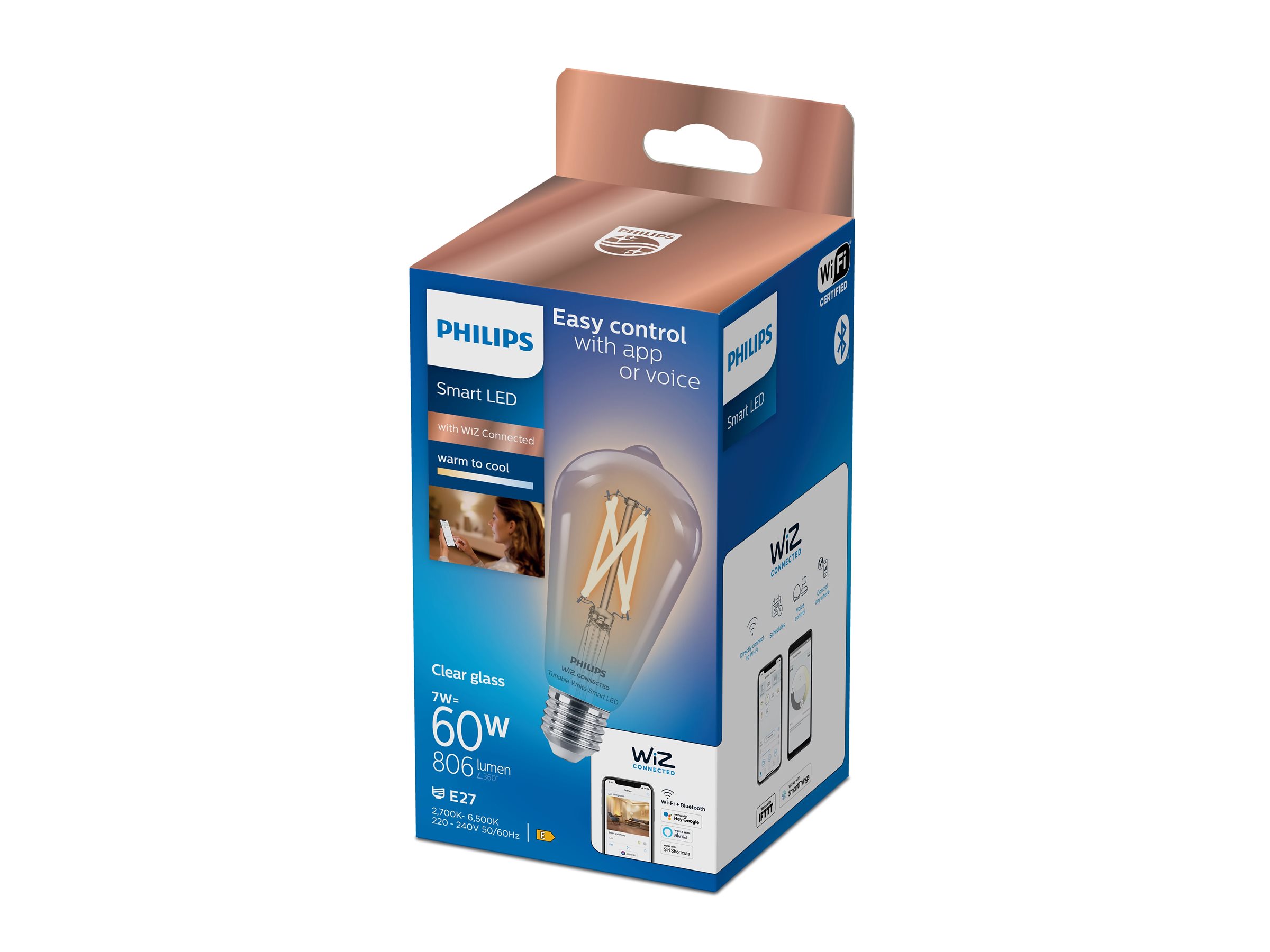 | Produktbeskrivelse | Philips Smart - LED-filament-lyspære - form: ST64 - E27 - 7 W - varmt til køligt hvidt lys - 2700-6500 K - gennemsigtig |