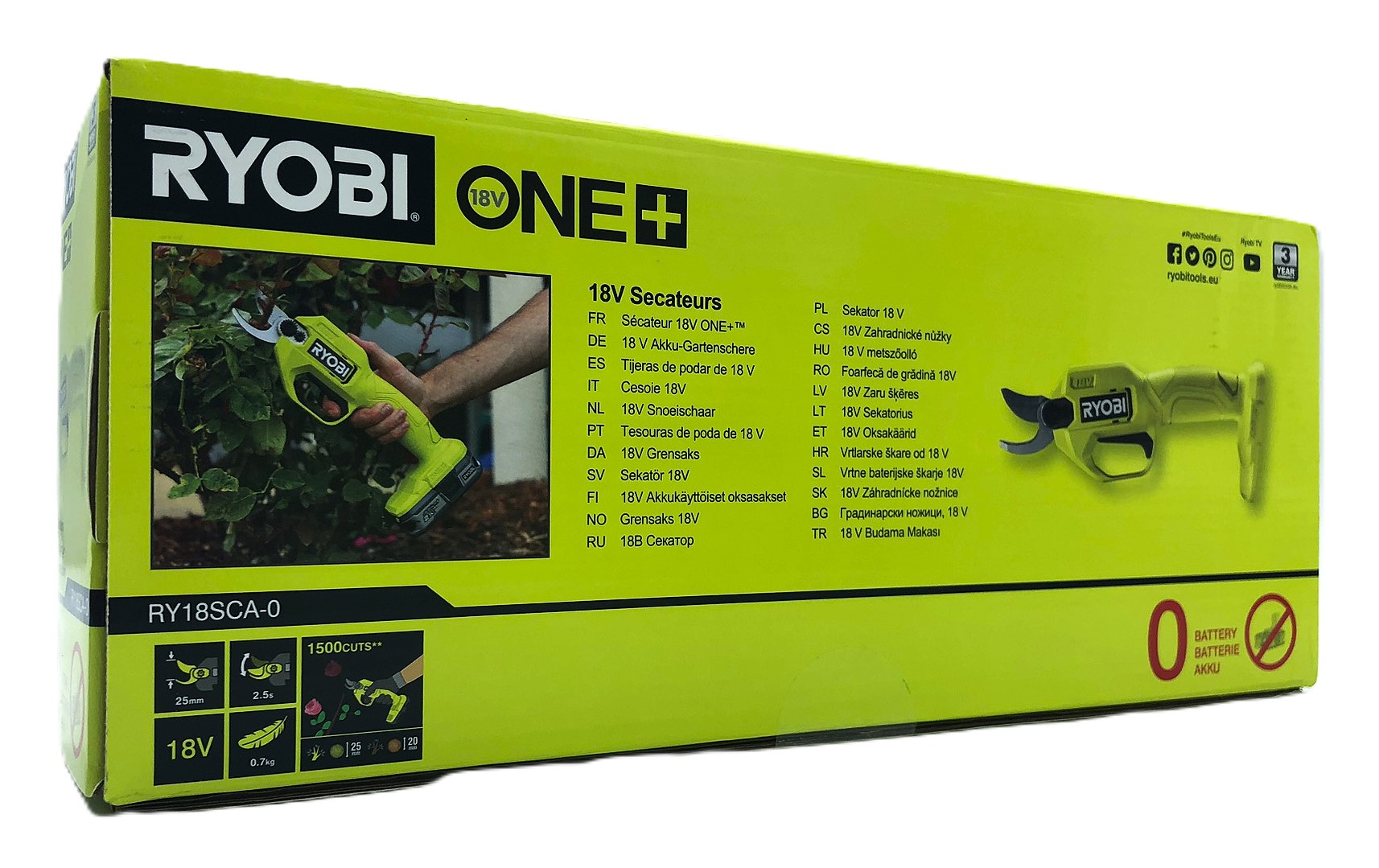 Ryobi - RY18SCA-0 - 18V Grensaks - 2.5 Cm Skæretykkelse - Batteridrevet - Letvægts - Ergonomisk Design - Medfølger ikke batteri