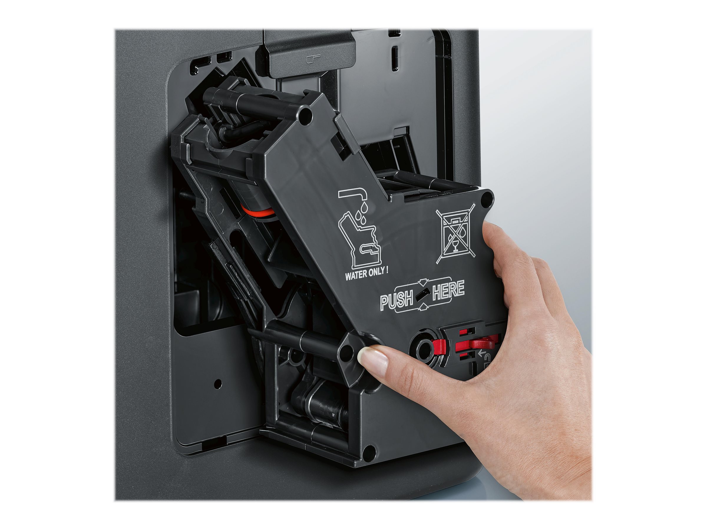 | Inkluderet tilbehør | Mælke sugedyse, test til vand hårdhed, måle ske, Brita Intenza filterpatron, mælkebeholder |