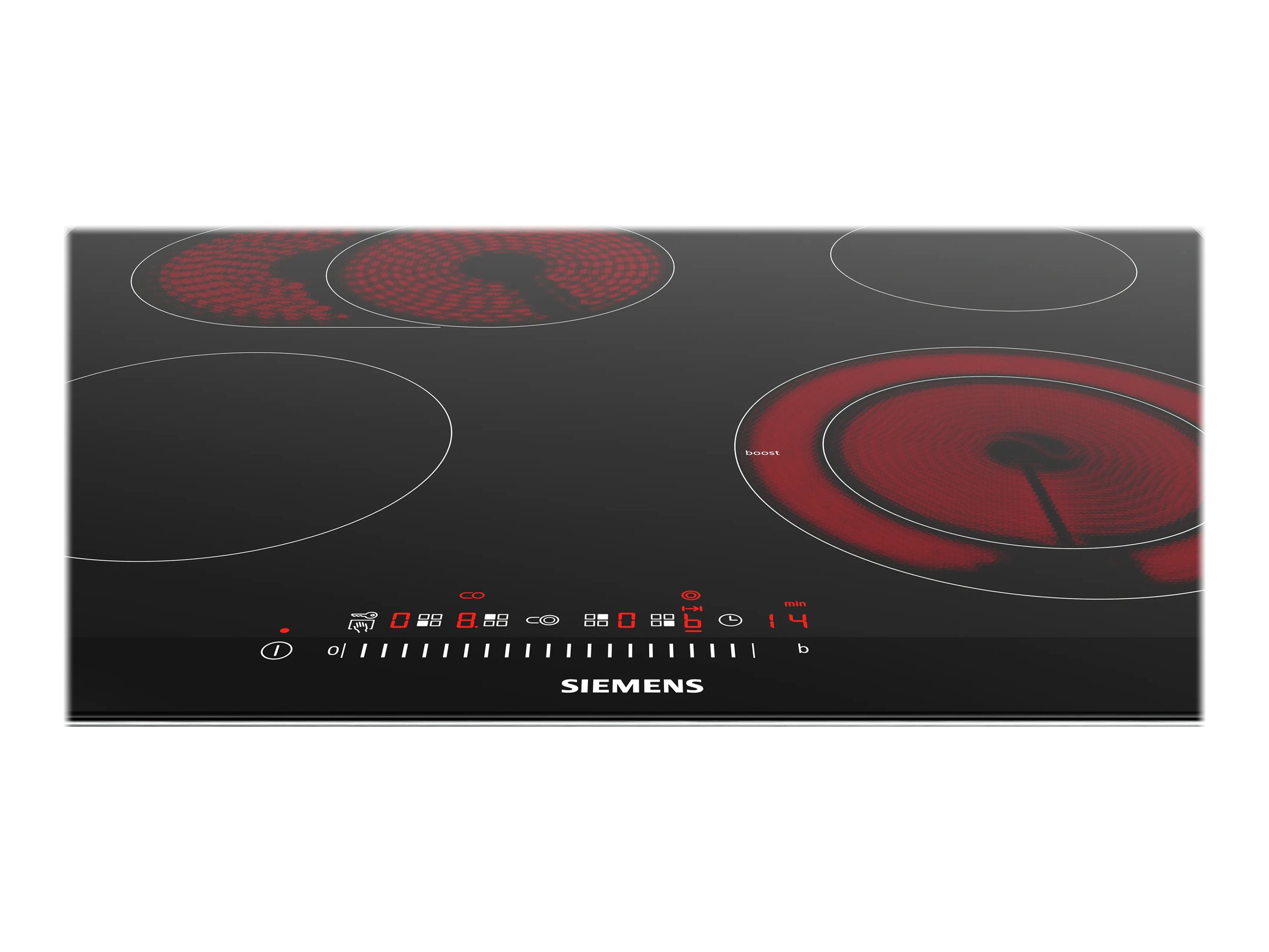 | Bordkomfurdetaljer | 1 x keramisk strålingselement - highSpeed - 2000 W - 180 mm | 1 x keramisk strålingselement - highSpeed - 1800 W - 170 mm | 1 x keramisk strålingselement - dobbelt-ring highSpeed med PowerBoost - 1200/2100/3000 W - 145/210 mm | 1 x keramisk strålings |