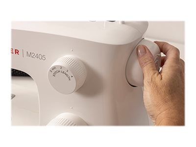 Singer M2405 har en tydelig stinglængdevelger, der gør det muligt at foretage præcise justeringer til forskellige stoftyper, hvilket gør syningen nemmere for både begyndere og erfarne brugere.