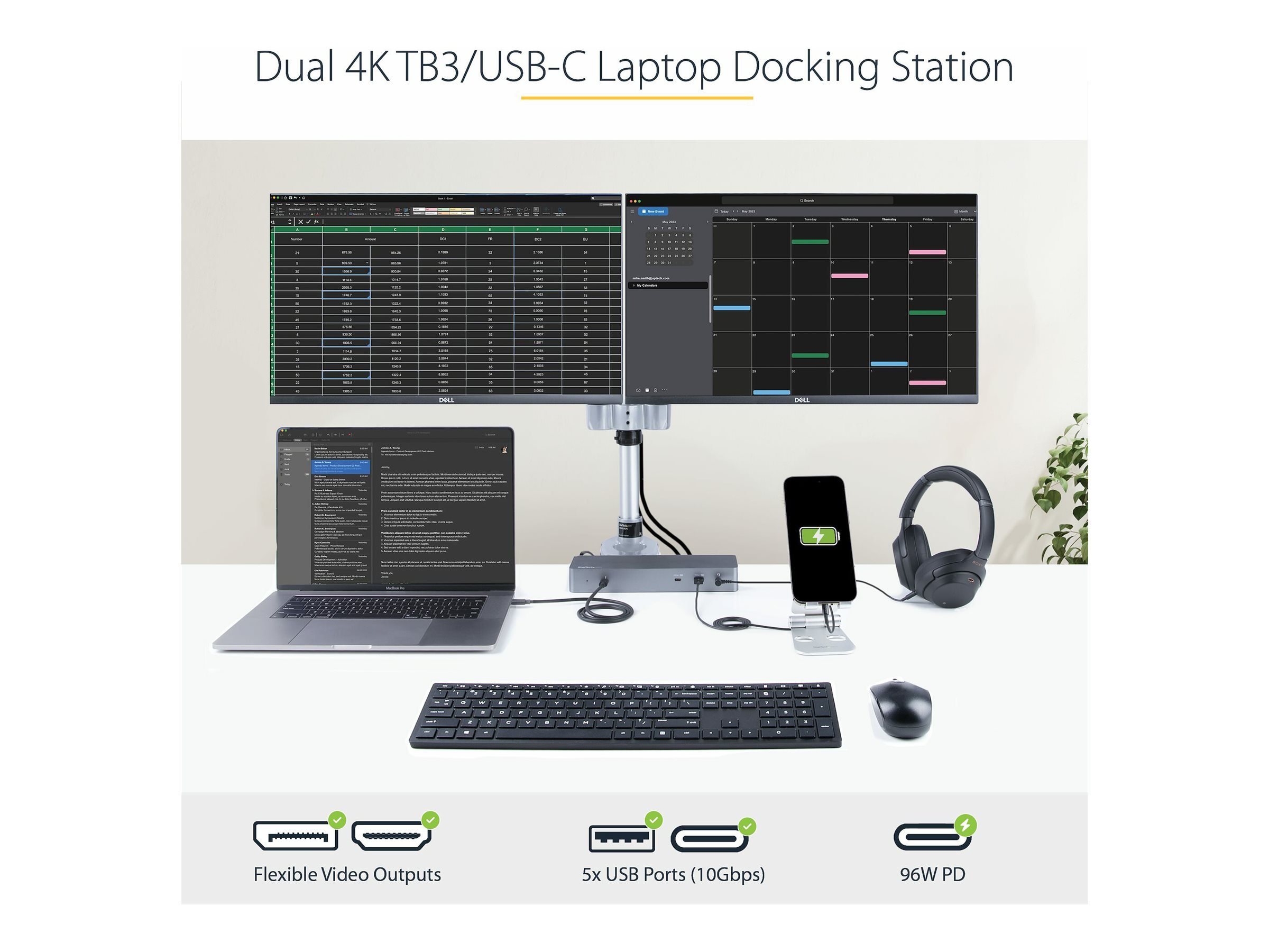 | Produktbeskrivelse | Startech Thunderbolt 3 Dock with USB-C Host Compatibility, Dual 4K 60Hz DisplayPort 1.4 or Dual HDMI 2.0 Monitors, Single 8K, TB3/USB-C Laptop Docking Station, 96W PD, 5x USB, 10Gbps - 96W Power Delivery (TB3CDK2DHUE) - dockingstation - USB-C 3.2 Gen 2 / Thunderbolt 3 - 2 x HDMI, 2 x DP - 1GbE |