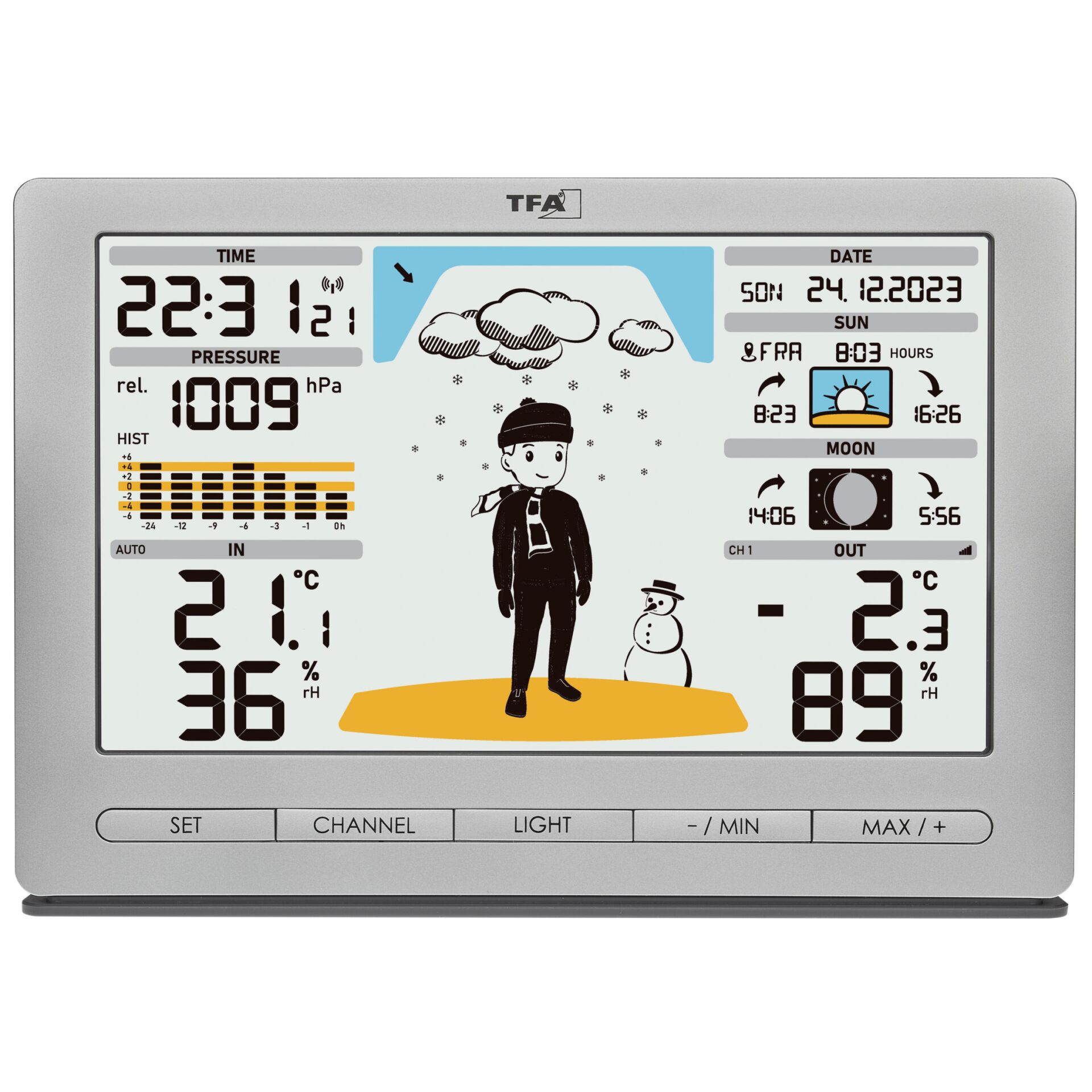 | Trend visning af målefunktioner | Barometer, Hygrometer, Termometer |
