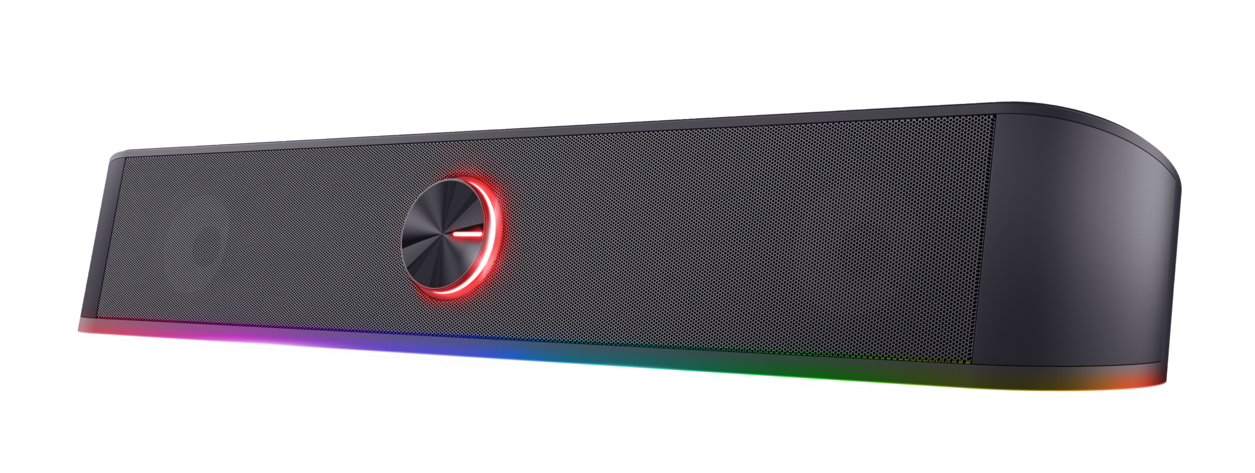 Stereo-soundbar med RGB-belysning og pladsbesparende design.