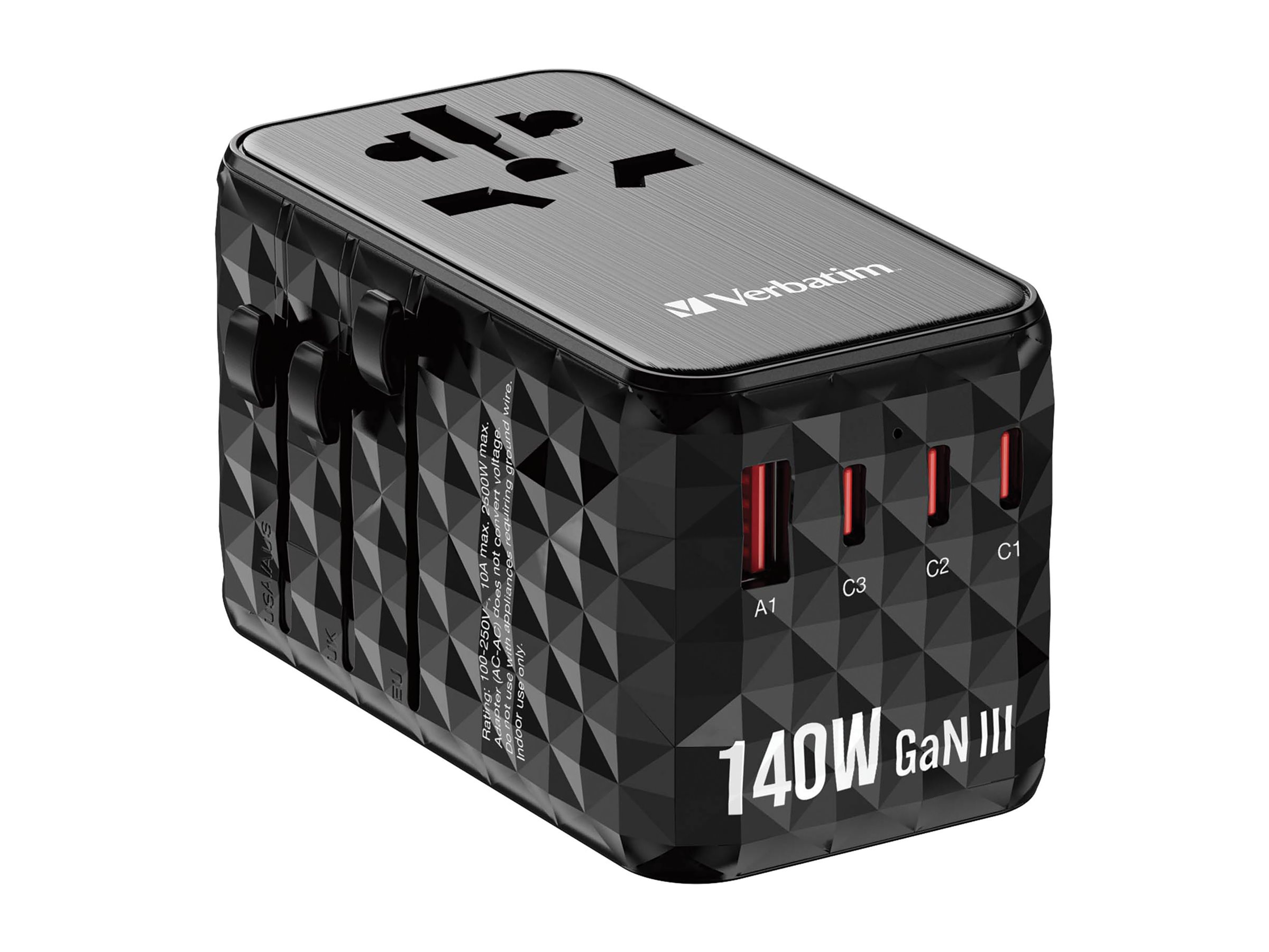 | Produktbeskrivelse | Verbatim UTA-10 strømforsyningsadapter - GaN III, universel - 3 x USB-C, USB - 140 Watt |