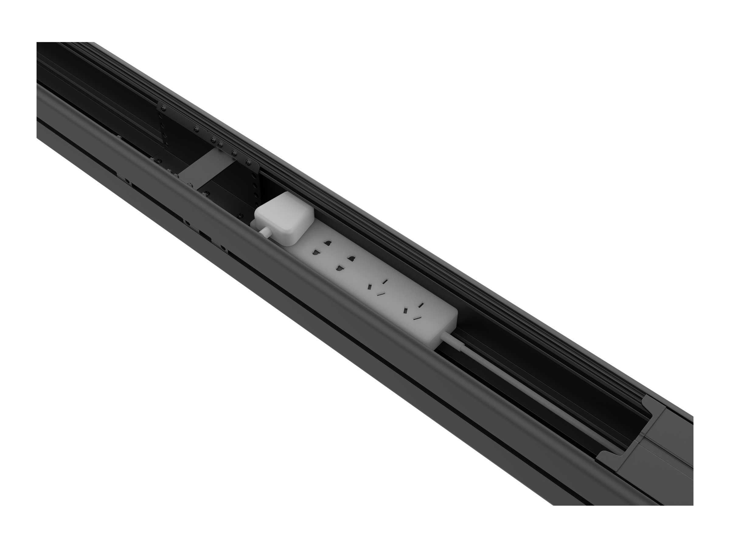 The cable management channel efficiently organizes and conceals wiring, contributing to a clean and professional appearance.