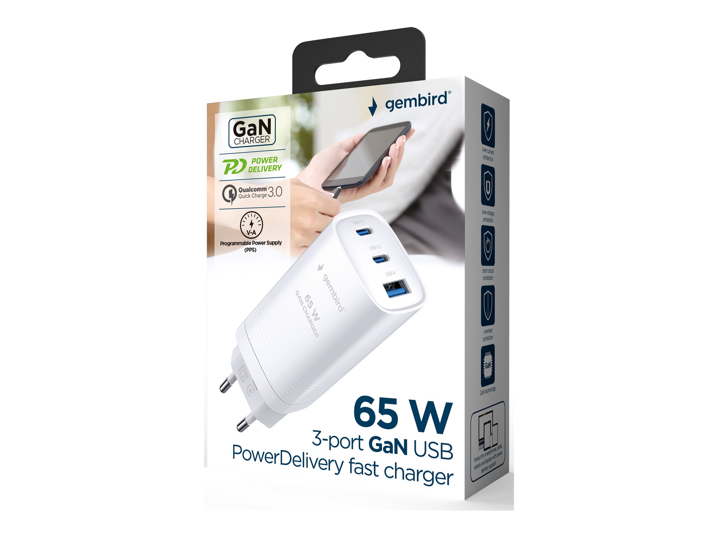 | Produktbeskrivelse | Gembird strømforsyningsadapter - USB, USB-C - 65 Watt |