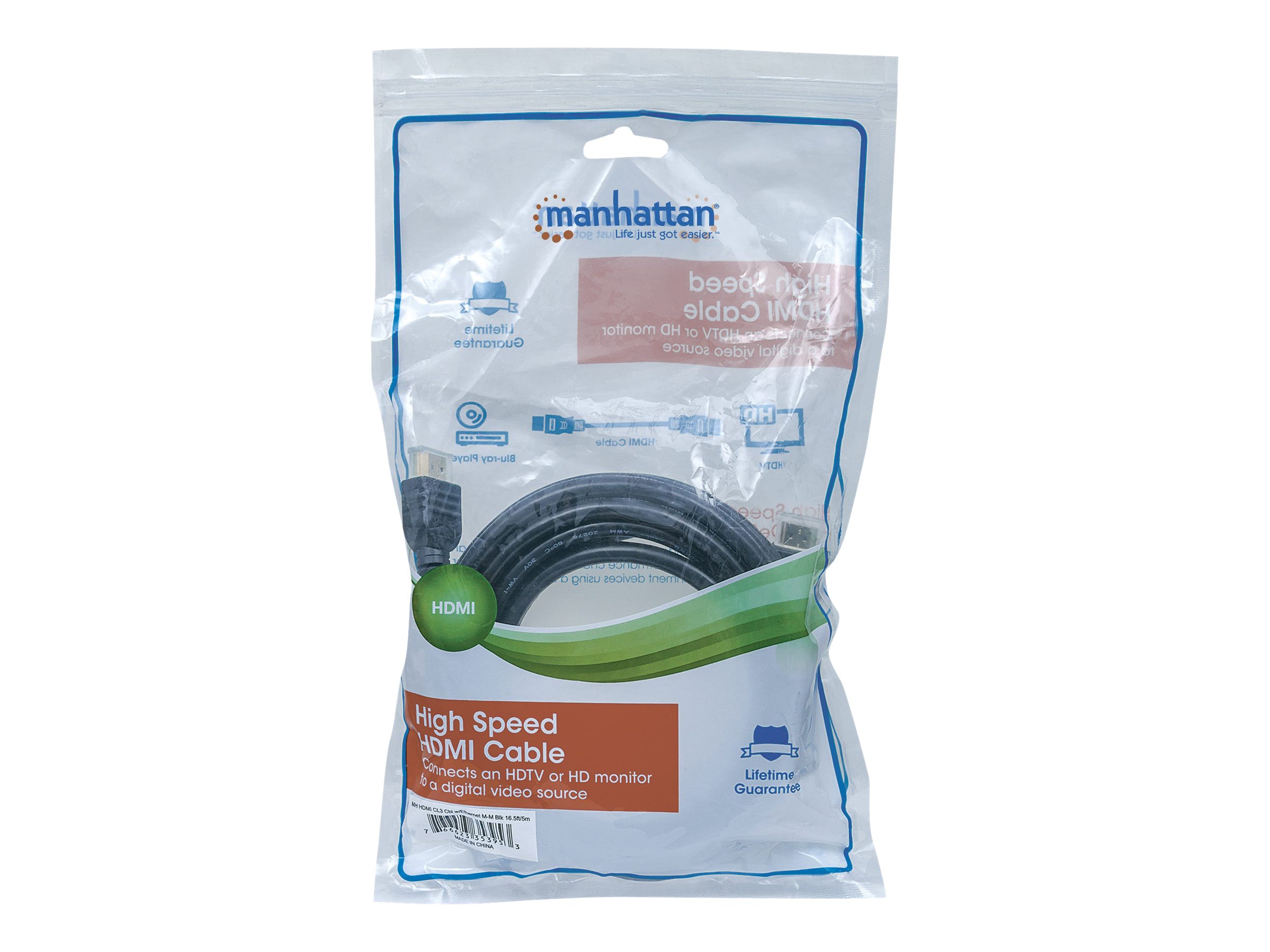 | Produktbeskrivelse | Manhattan HDMI Cable with Ethernet (CL3 rated, suitable for In-Wall use), 4K@60Hz (Premium High Speed), 5m, Male to Male, Black, Ultra HD 4k x 2k, In-Wall rated, Fully Shielded, Gold Plated Contacts, Lifetime Warranty, Polybag - HDMI-kabel med Ethernet - 5 m |