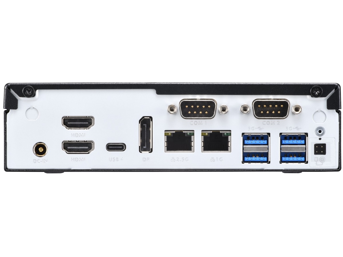 | Back Panel connectors | 1x HDMI 2.1 supports 8K/60Hz, 1x HDMI 2.0 supports 4K/60Hz, 1x DisplayPort (DP 1.4a), 1x USB4 as USB-C port supports DP 1.4a, USB4 (20 Gbit/s) and 3A charging current, 4x USB 3.2 Gen 1 Type A (blue), 1x 2.5G LAN (RJ45, Intel i225), 1x 1.0G LAN (RJ45, Intel i219), 2x RS232 serial port, 9-pin D-Sub (5/12V, 1x RS422/RS485), 1x DC-input connector for external power adapter (supports 12V and 19.5V), 1x 4-pin connector (External power button, Clear CMOS, +5V) |