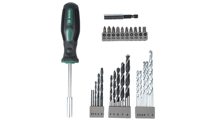 Bosch 2 607 017 201. Antal bits: 27 stk. Pakkebredde: 170 mm, Pakkedybde: 35 mm, Pakkehøjde: 245 mm. Pakketype: Blister