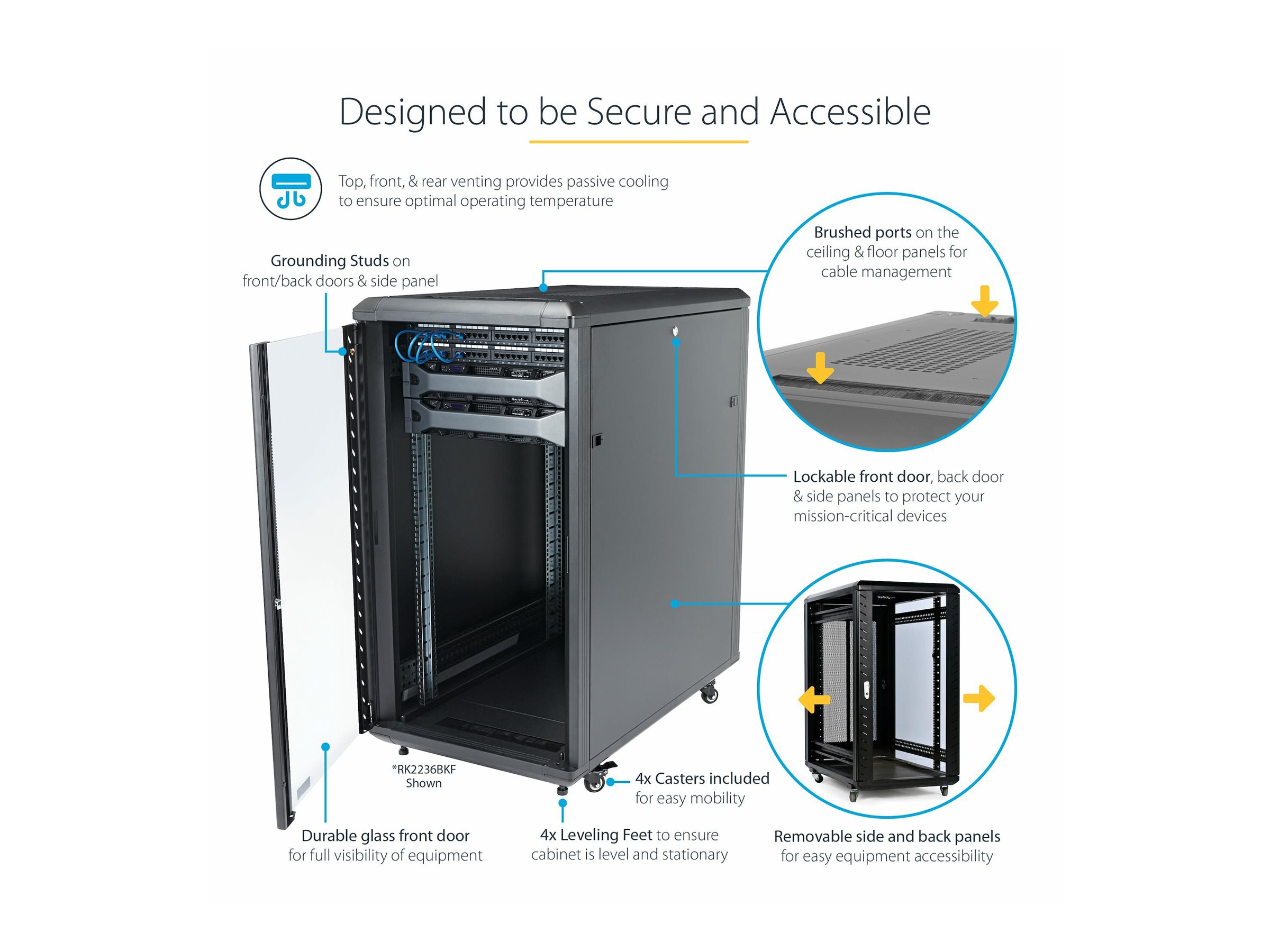 | Features | Key lock, integrated cable management, flat pack, adjustable mounting rails |