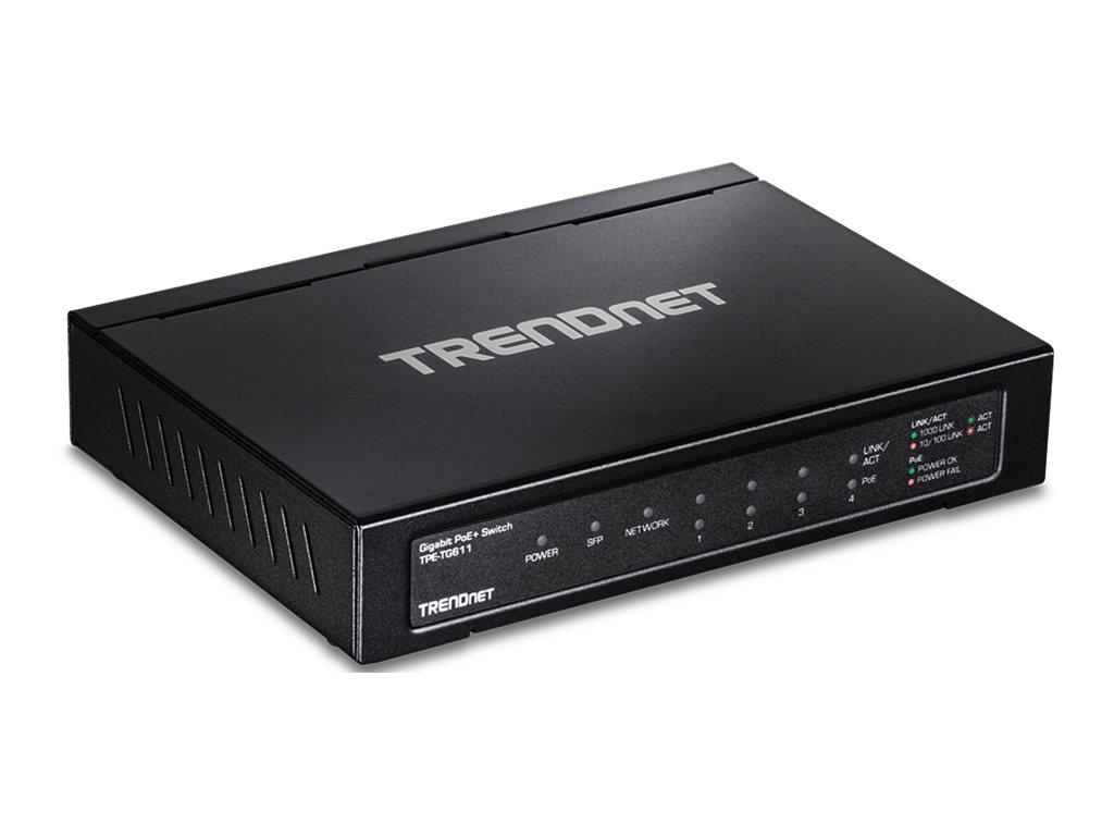 TRENDnet TPE TG611 - Switch - 4 x 10/100/1000 (PoE+) + 1 x 10/100/1000 (uplink) + 1 x Gigabit SFP - desktop - PoE+ (65 W) - TAA-kompatibel