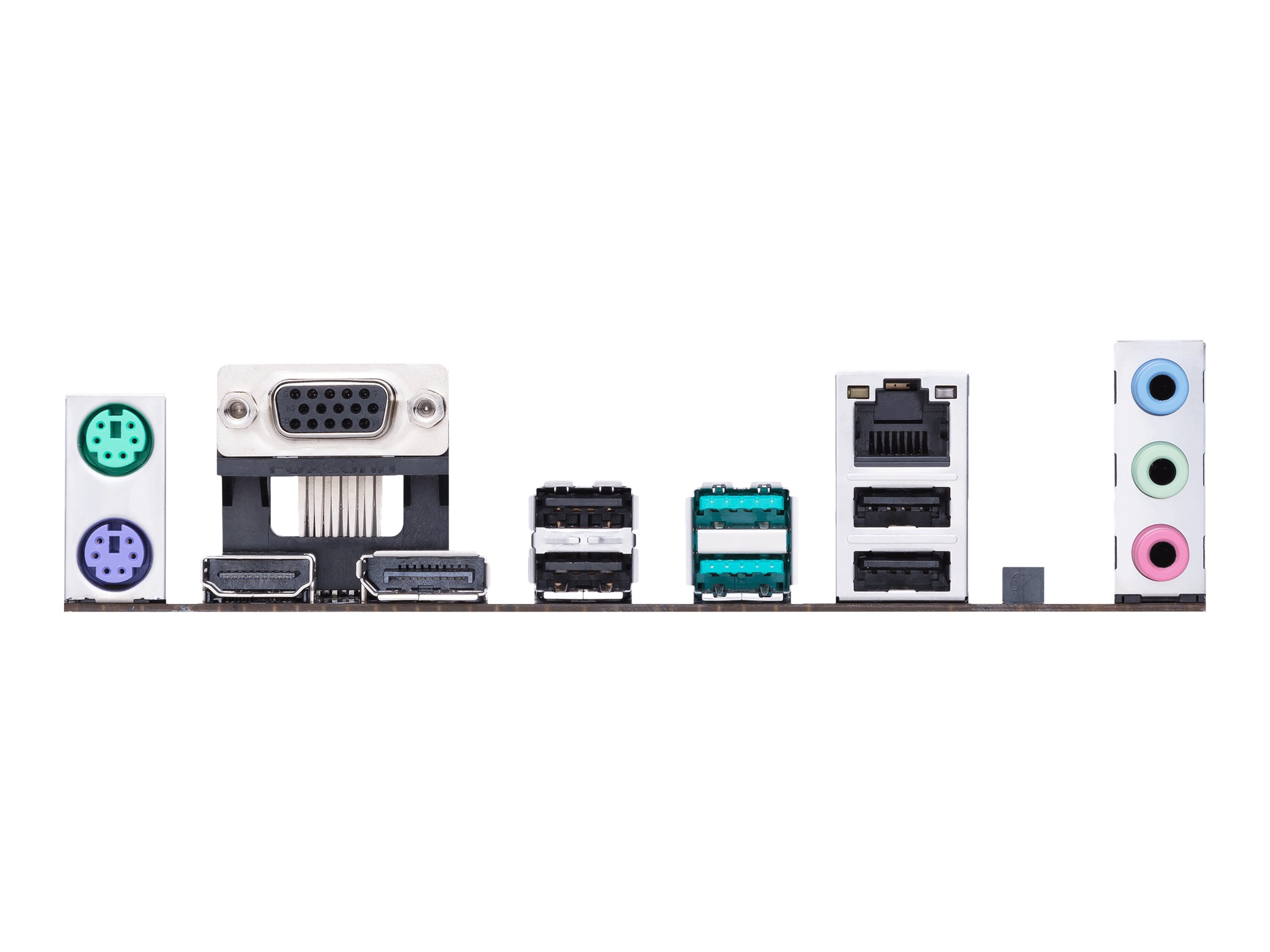 | Gränssnitt | 1 x HDMI | 1 x DisplayPort | 1 x VGA | 2 x USB 3.2 Gen 2 | 1 x PS/2-mus | 4 x USB 2.0 | 1 x PS/2-tangentbord | 1 x ljudingång - mini-jack | 1 x ljudutgång - mini-jack | 1 x mikrofon - mini-jack | 1 x PS/2-mus |