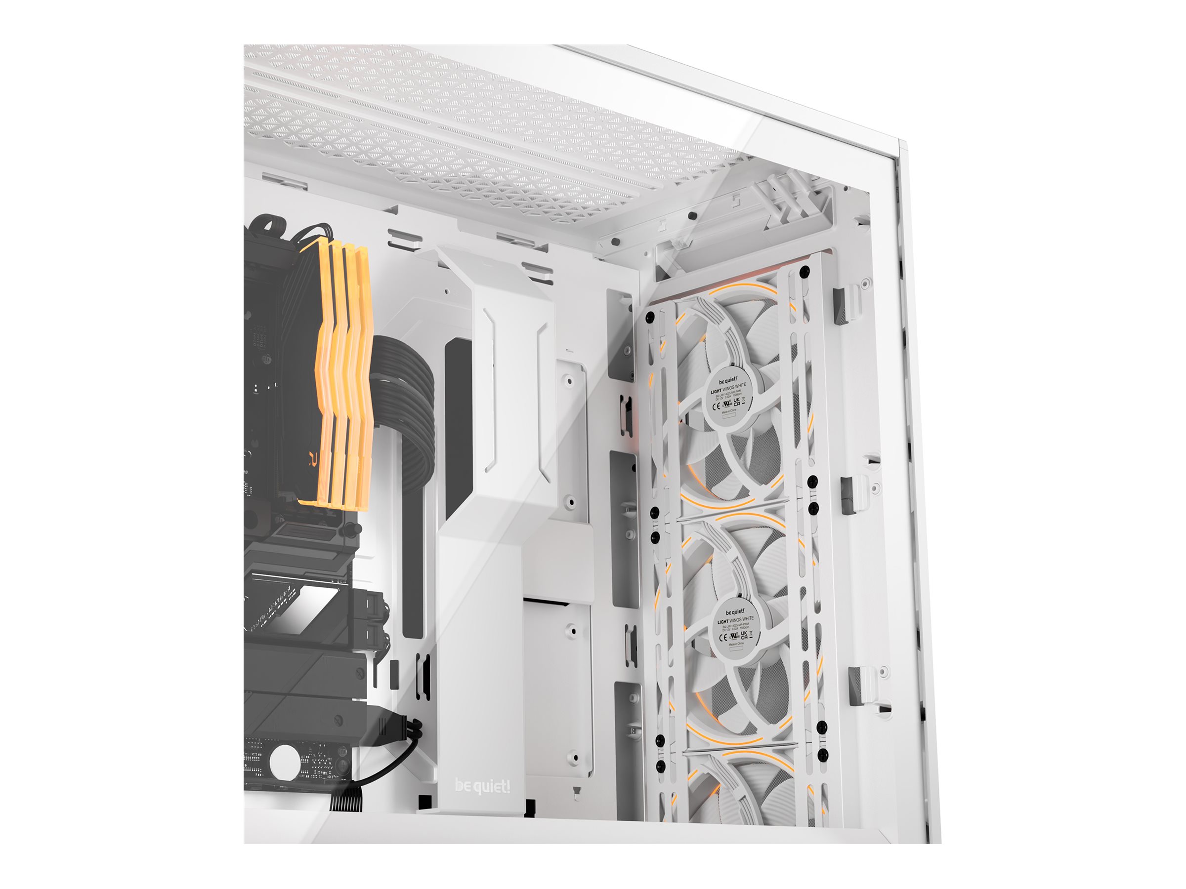 Udstyret med et omfattende kølesystem, herunder 3 Light Wings-blæsere foran og 1 bagpå med PWM-understøttelse og ekstra monteringer til op til 3 top- og 1 bundblæser eller radiatorer, hvilket sikrer optimal luftgennemstrømning og temperaturkontrol.