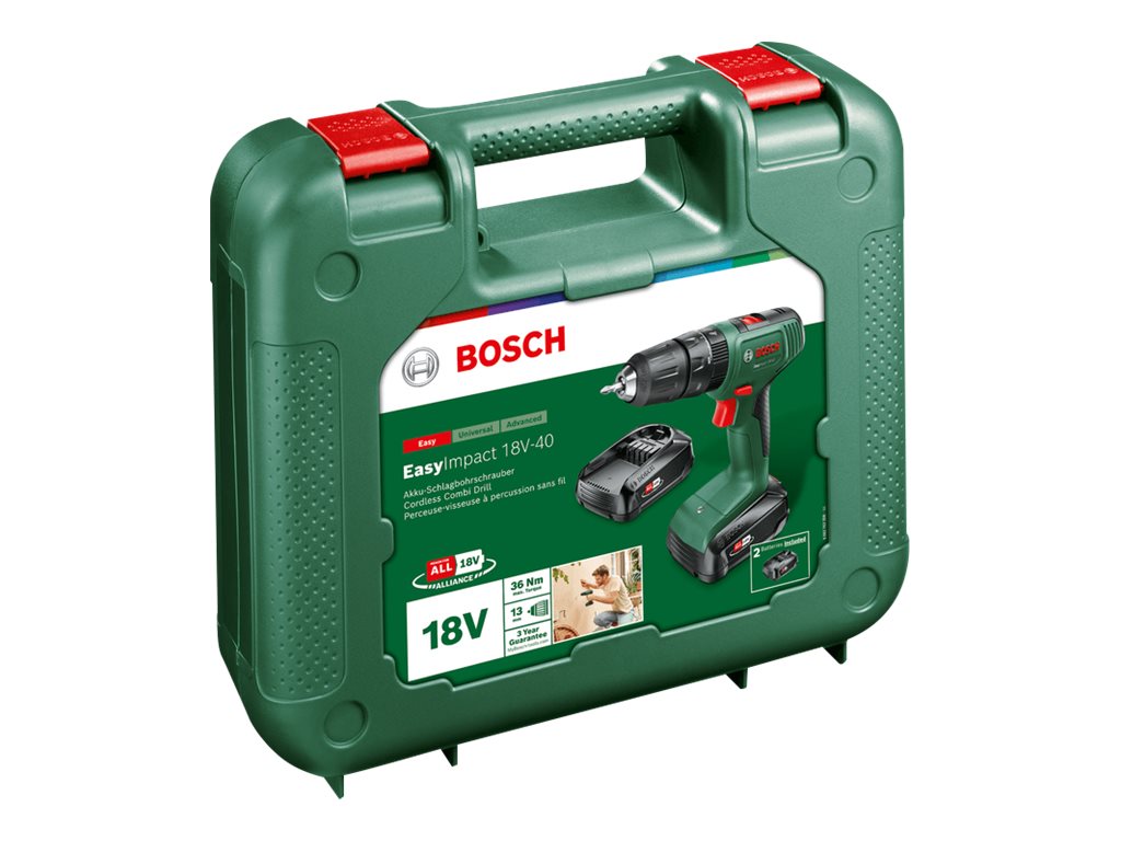 | Produktbeskrivelse | Bosch EasyImpact 18V-40 hammerbor/skruemaskine - ledningfri - 2-hastigheders - 2 batterier, inkluderet oplader |