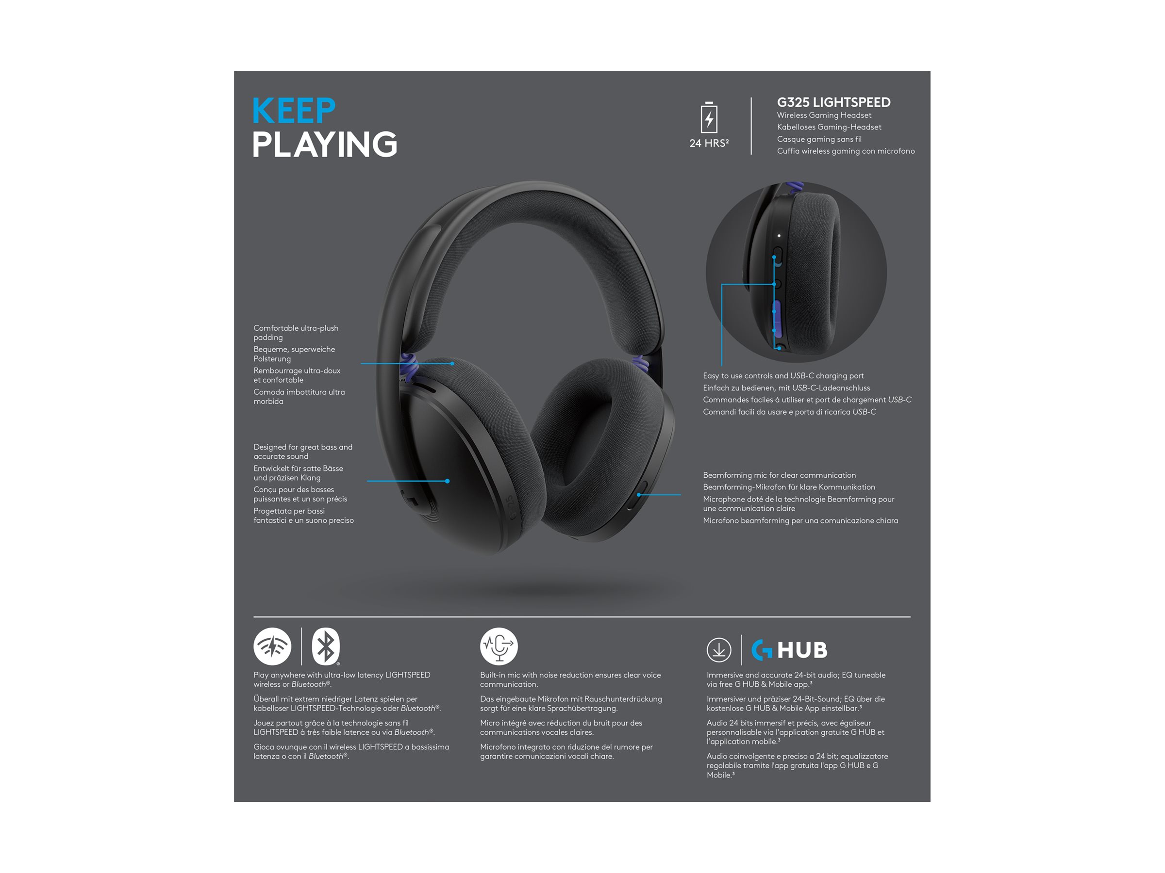 G325 bruger 24-bit lyd, der er skabt til gaming, og en beamforming-mikrofon uden arm og er samtidig let, stilfuldt og behageligt at have på, så du hurtigt kan fordybe dig i dit spil