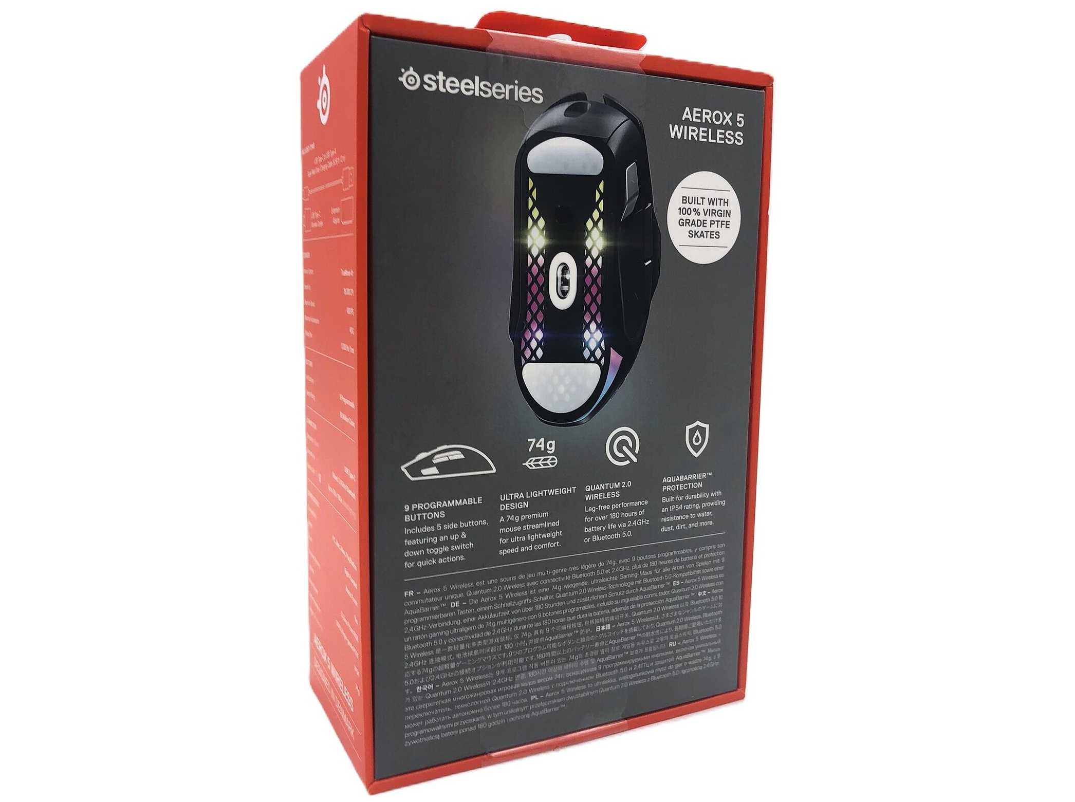 | Egenskaper | Scrollhjul, fötter av polytetrafluoretylen (PTFE), 9 programmerbara knappar, 16,8 miljoner mångfärgad belysning, Zero Hardware Acceleration, löstagbar kabel, 3 RGB-zoner, AquaBarrier Protection, SteelSeries TrueMove-luftgivare, Quantum 2.0 trådlös te |