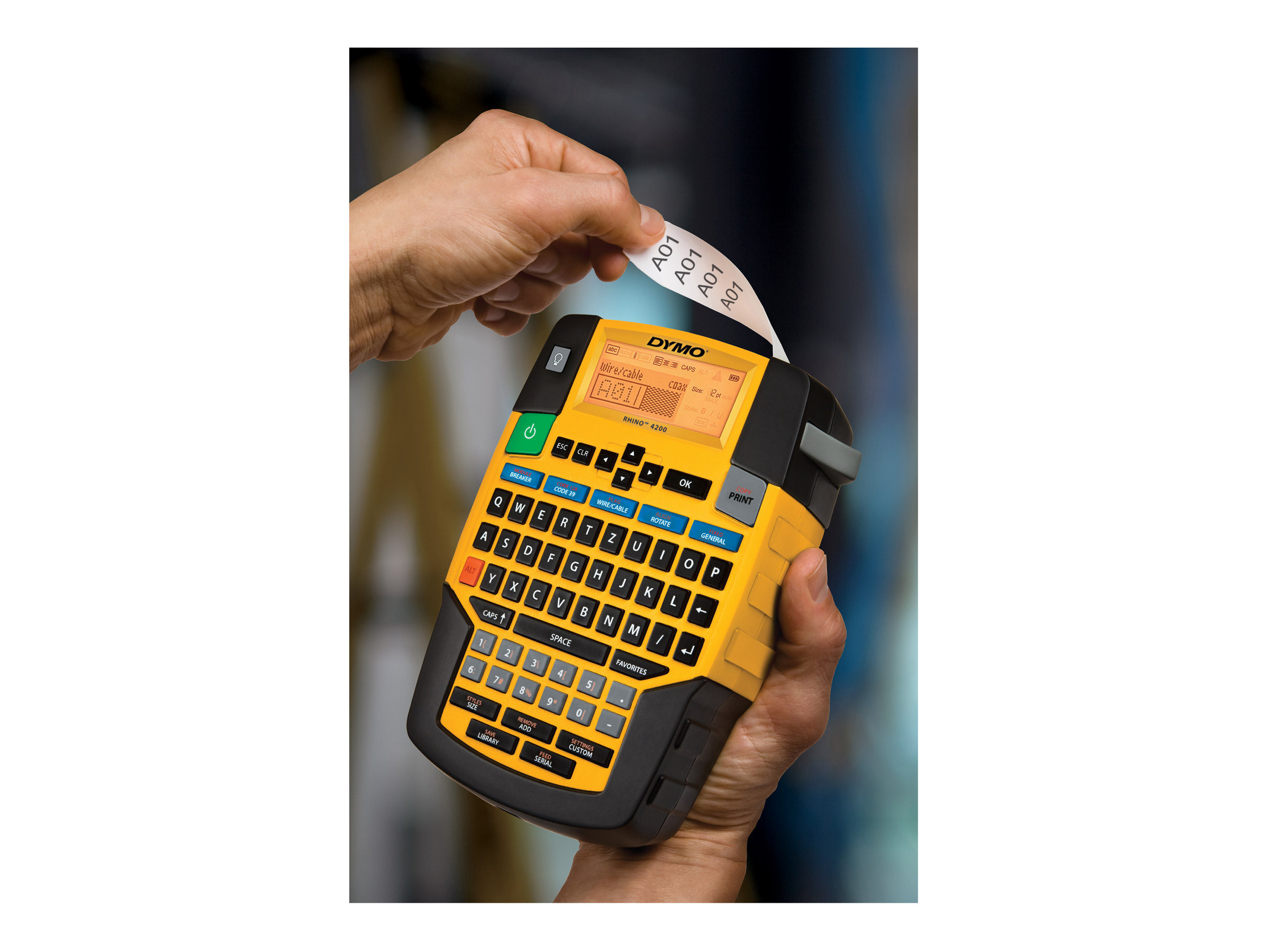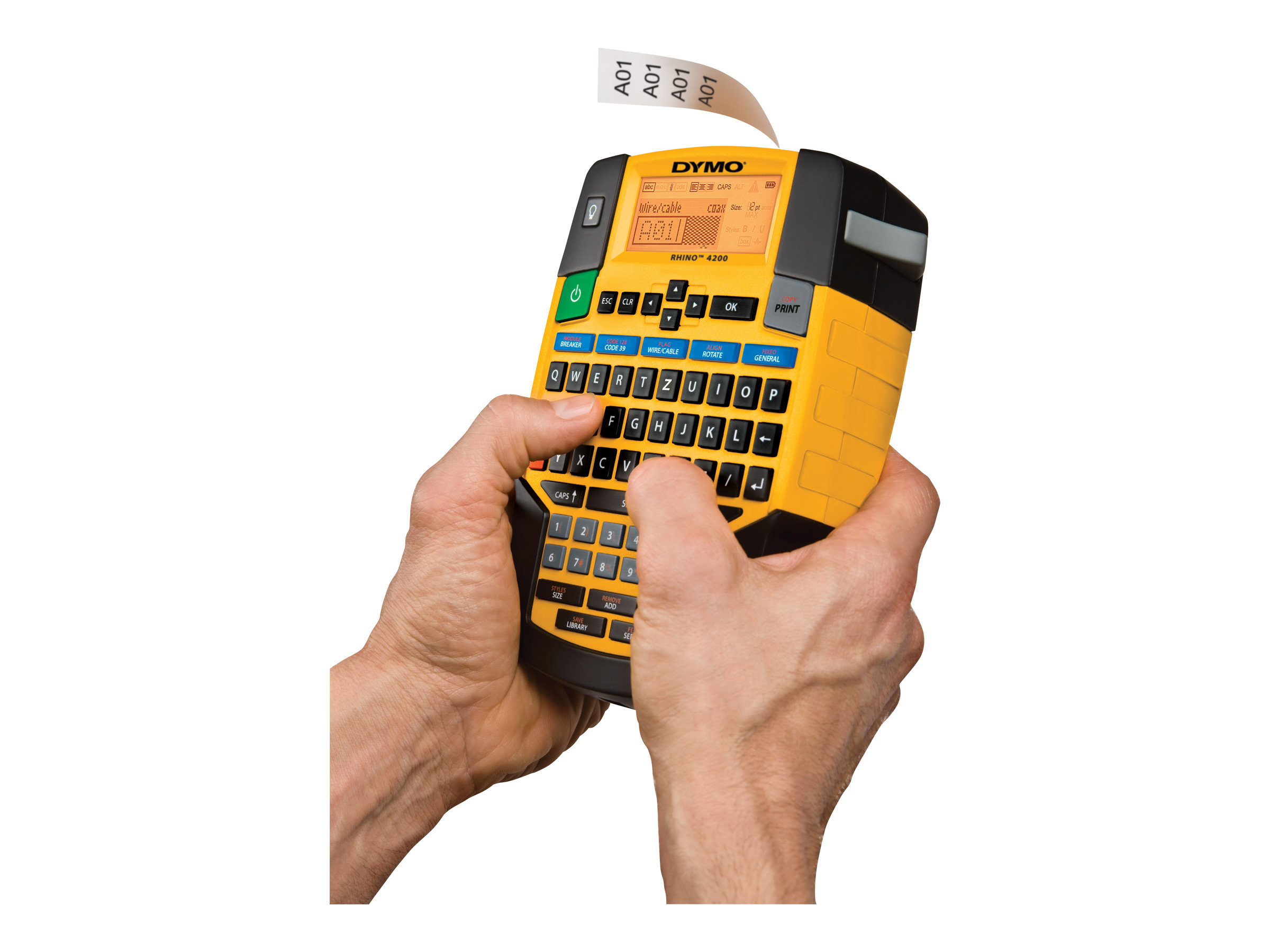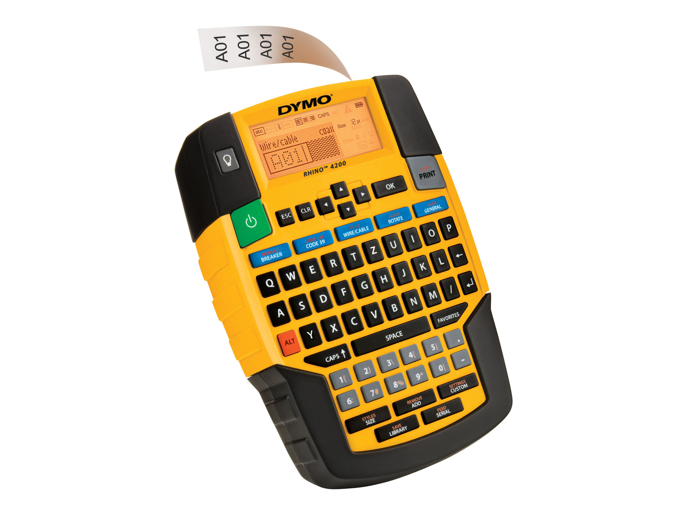 Med DYMO Rhino 4200 klarer du etiketmærkningen hurtigt - og rigtigt. Det velkendte tastatur af computertypen (QWERTY) er nemt at bruge. Med genvejstasterne skal du kun trykke én gang for hurtigt at oprette og formatere etiketter til omvikling på kabler/ledninger, faneetiketter, etiketter med stregkodetype Code39 og Code128, etiketter med fast længde, moduletiketter mm. Udskriv etiketter på op til 19 mm bred fleksibel nylon, permanent polyester og slidstærke vinylmaterialer - PLUS udskriver direkte på krympeflex. Sparer endnu mere tid med stærke funktioner - som fx tasten "Favorites" med ét-tryksadgang til hyppigt brugte etiketter, symboler og betegnelser, og tasten "Custom" til at undgå gentagen indtastning ved at gemme brugerspecifikke indstillinger.
