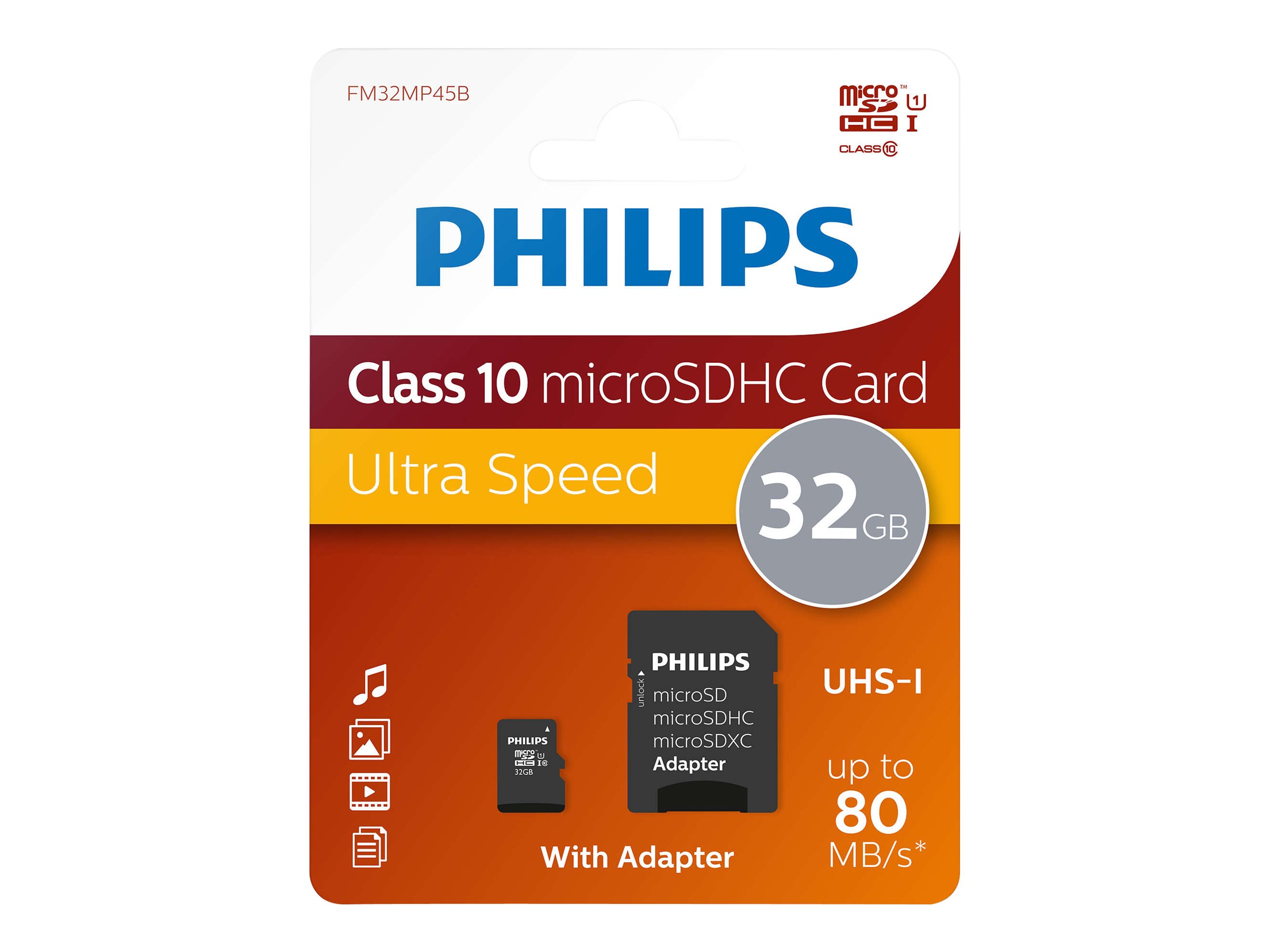 | Produktbeskrivelse | Philips FM32MP45B - flashhukommelseskort - 32 GB - microSDHC UHS-I |