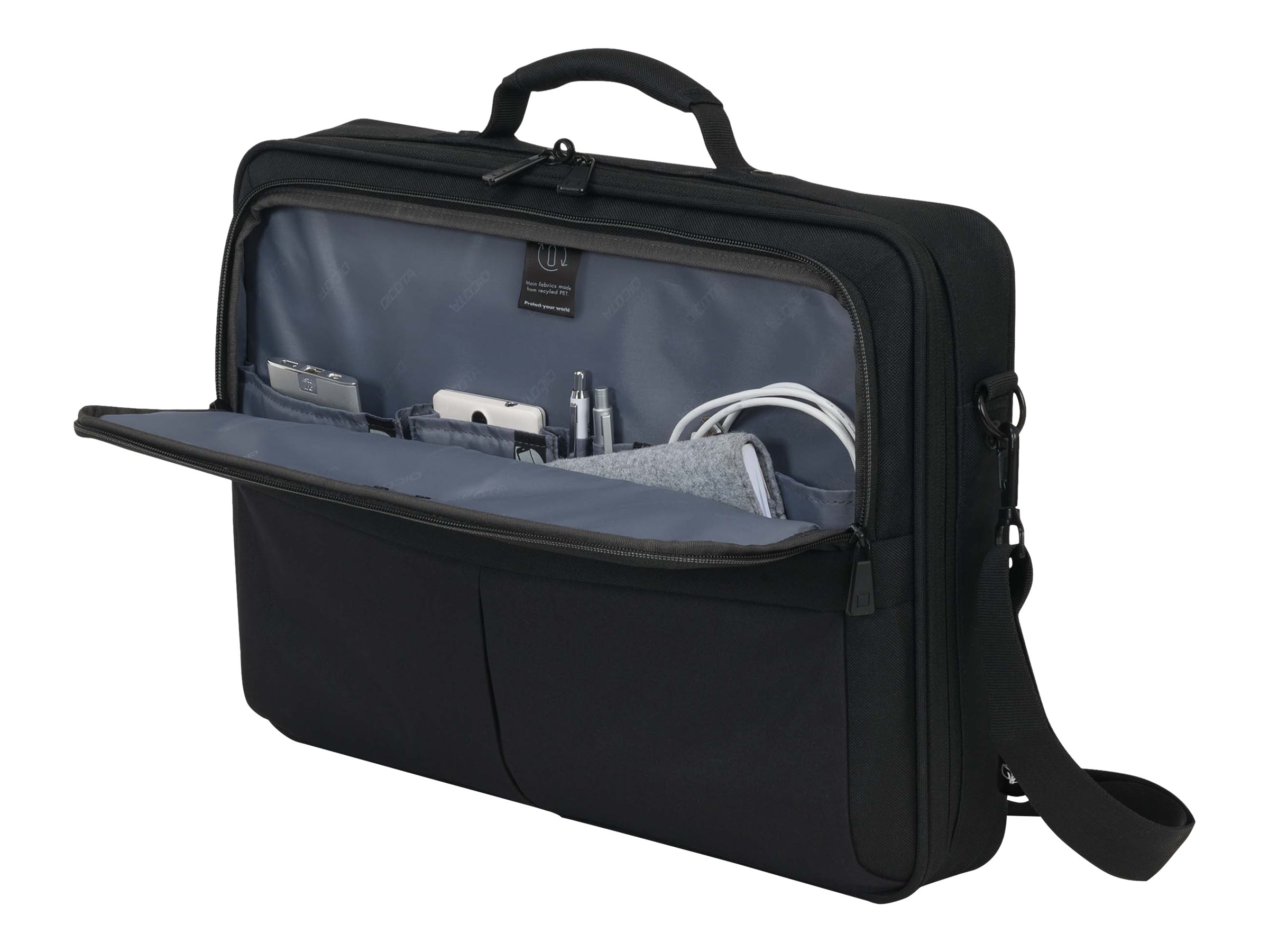 DICOTA Eco Multi SCALE-bæretasken har flere rum, herunder en skillevæg, en forlomme og en indvendig stiklomme, og tilbyder organiseret opbevaring af alle dine vigtigste ting, sammen med 12,9" tabletstøtte til dine digitale enheder.