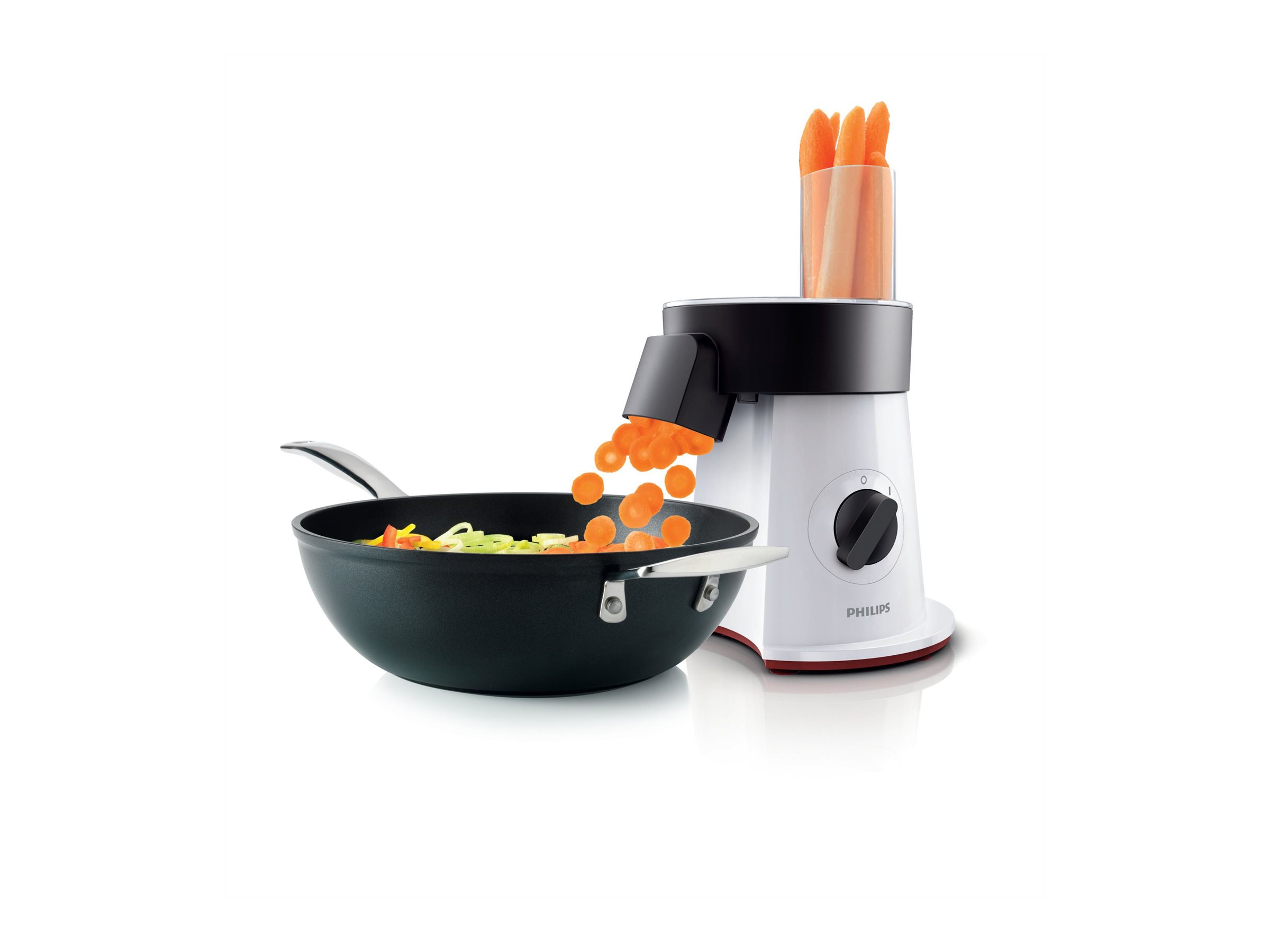 Philips SaladMaker kan snitte, rive og skære grøntsager, ost, salami med mere i julienne direkte i din salatskål, madgryde og wokpande. Med XL julienneskiven kan du nu også skære kartofler til pommes frites. Salater med mere på få sekunder.