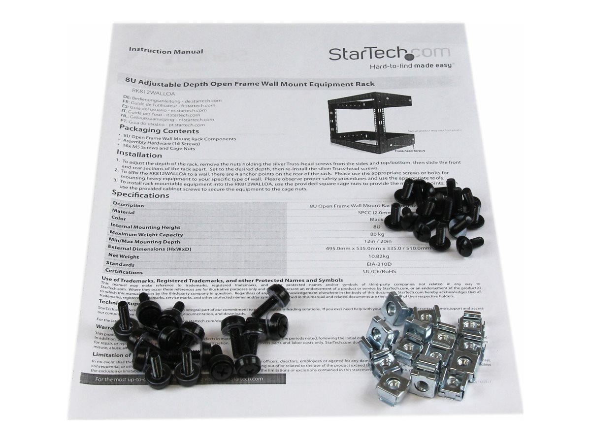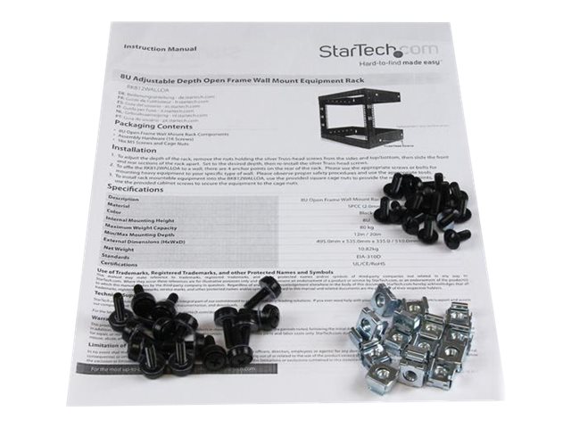 | Produktbeskrivelse | Startech 8U 19" Wall Mount Network Rack - 12" Deep 2 Post Open Frame Server Room Rack for Data/AV/IT/Computer Equipment/Patch Panel with Cage Nuts & Screws 135lb Capacity, Black (RK812WALLO) - rack - 8U |