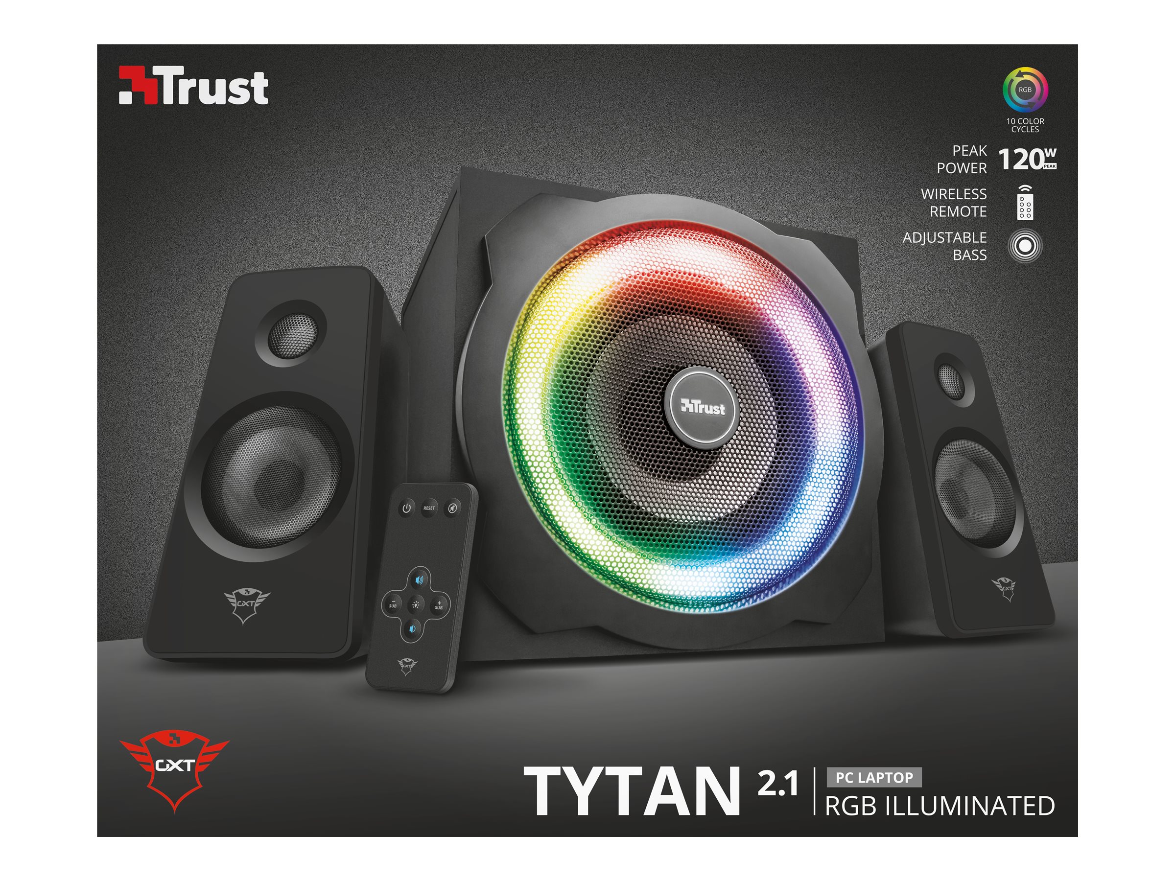 En overvældende baskvalitet, lyd af høj kvalitet og et imponerende spilledesign kombineret i ét: GXT 629 Tytan 2.1 RGB-højttalersættet vil ændre din oplevelse af lyd. Hvadenten du spiller de nyeste spil, lytter til musik eller ser film, du kan nyde alt med den bedst tilgængelige sound.