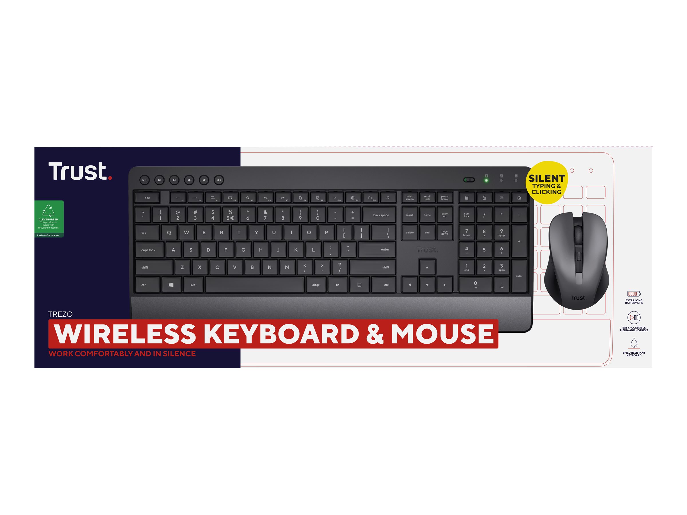 | Produktbeskrivelse | Trust Trezo Comfort - sæt med mus og tastatur - stille - QWERTY - Amk. engelsk - sort Indgangsudstyr |
