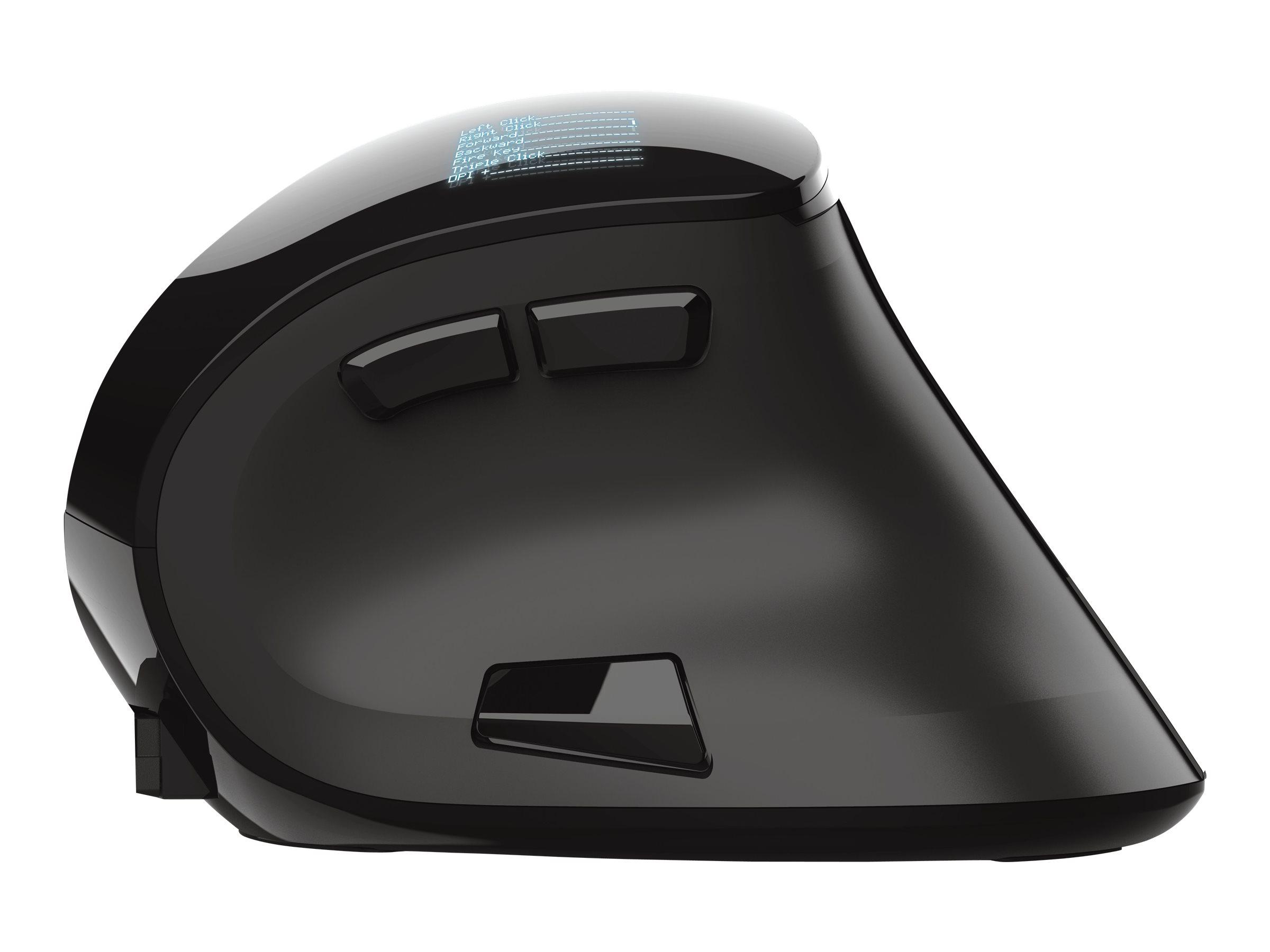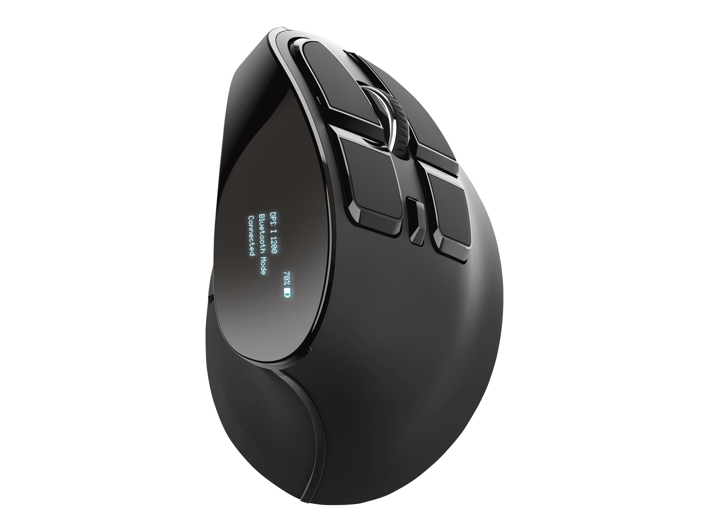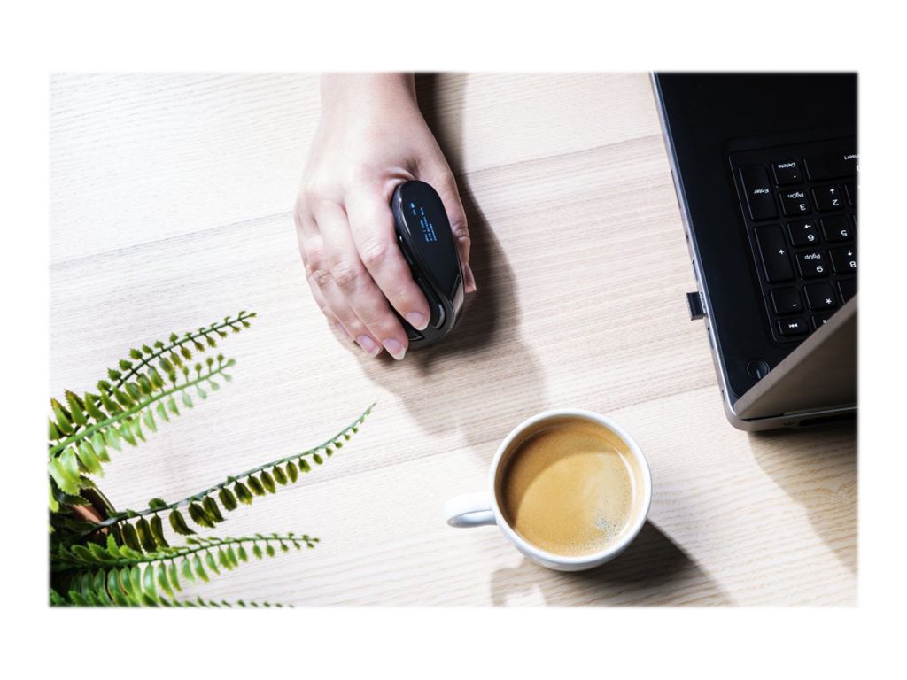 Trådløs, genopladelig mus med digitalt display og ergonomisk, lodret design for optimal komfort.
