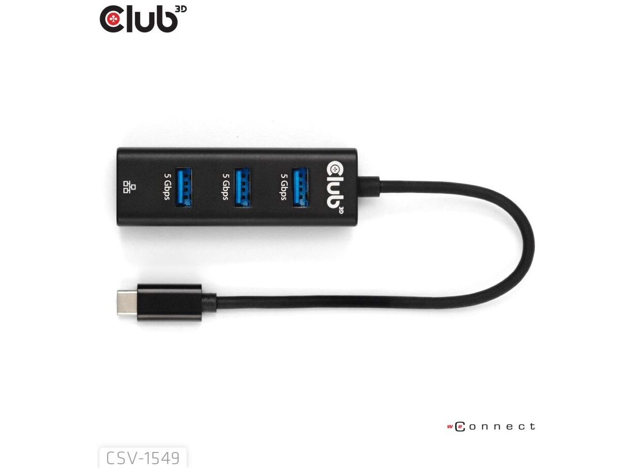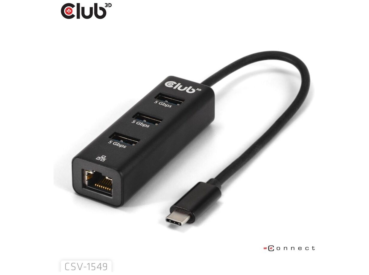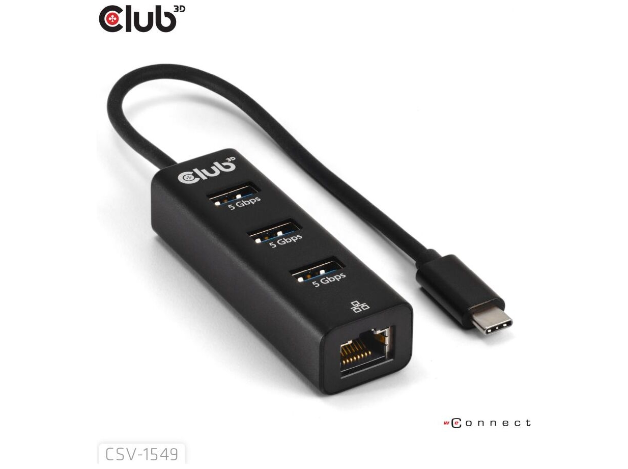 Club 3D CSV-1549 USB-C gen 1 til 3xUSB-A og RJ45 USB Hub Sort