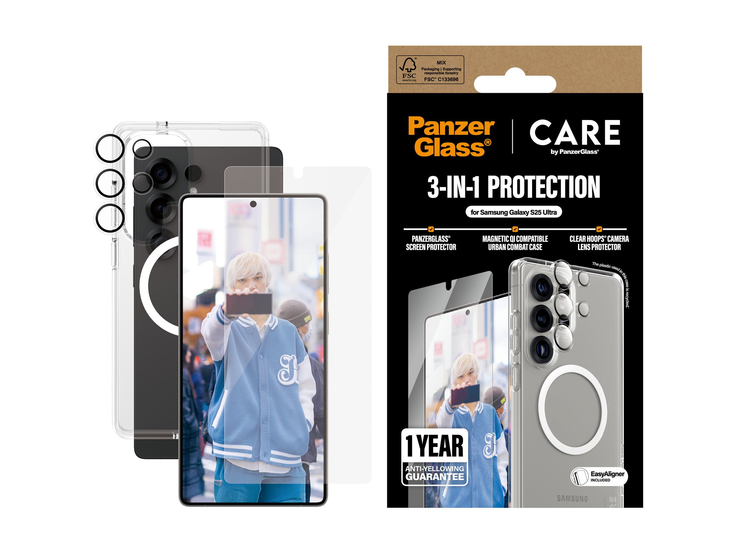 Beskyttelse til din telefon med stil? Ja tak! Med PanzerGlass Flagship 3-i-1 Pakke får du både fashion og bæredygtighed i ét! Denne pakke leverer førsteklasses beskyttelse, samtidig med at den fremhæver din telefons elegante design. Pakken inkluderer:PanzerGlass Skærmbeskytter Ultra-Wide Fit: Lavet af 60 % genanvendt glas, beskytter denne skærmbeskytter din telefon mod ridser og stød. Den dækker fra kant til kant og opretholder skærmens klarhed og responsivitet.PanzerGlass Transparent Hoops Kameralinsebeskytter: Holder dine kameralinser sikre mod ridser og skader, så du kan fortsætte med at fange skarpe, højopløselige billeder.CARE by PanzerGlass Urban Combat Transparent Case med Hvid QI Compatibel: Vores fremragende valg, der tilbyder den perfekte blanding af styrke og elegance. Denne robuste, faldtestede case (op til 3,6 meter) er lavet af 100 % genanvendte materialer og designet til Qi-kompatibilitet. Dens slanke, transparente design lader din telefons naturlige skønhed skinne igennem, mens den giver maksimal beskyttelse.Nem montering af skærmbeskyttelsen med den medfølgende EasyAligner, der sikrer, at resultatet altid bliver perfekt. Har du brug for en ekstra hjælpende hånd? Bare scan QR-koden til vores how-to-video.Afslut med at klikke Hoops -linsen på kameraet og Kickstand coveret på mobilen. Så kan du trygt bevæge dig ud i verden.Hos PanzerGlass beskytter vi ikke kun din enhed – vi gør også vores del for at beskytte planeten. Hver gang du vælger PanzerGlass , træffer du et bæredygtigt valg for fremtiden.